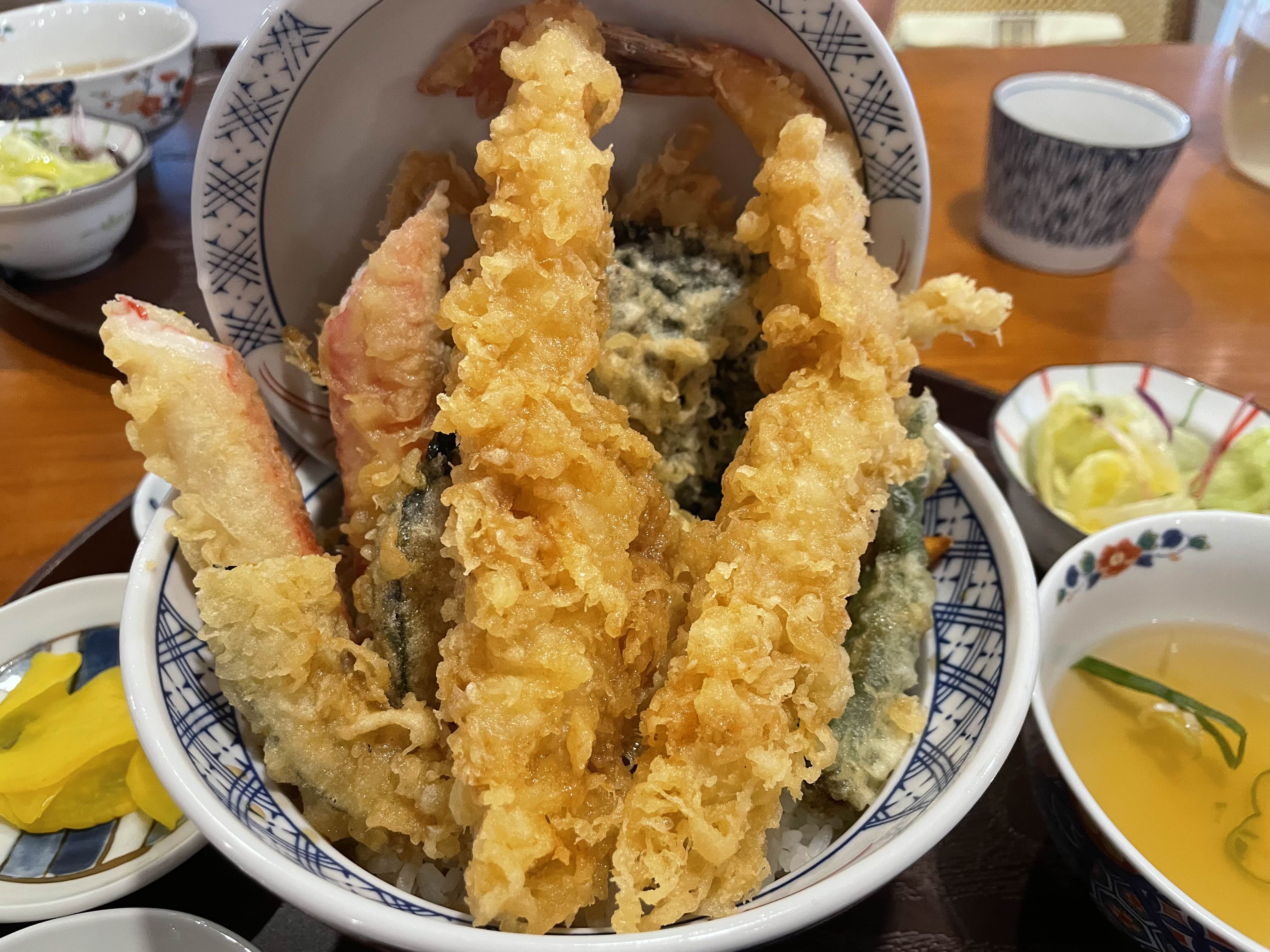 텐동의 튀김옷은 정말 바삭하게 되어있었는데요. 새우 2개, 게맛살 2개, 김 1개, 작은 고추 2개, 오징어, 팽이버섯 1개, 단호박? 고구마 2개 있더라고요. 튀김옷도 맛있었고 정말 깨끗한 기름에 튀겨진 느낌이어서 더 바삭하고 맛있었어요.