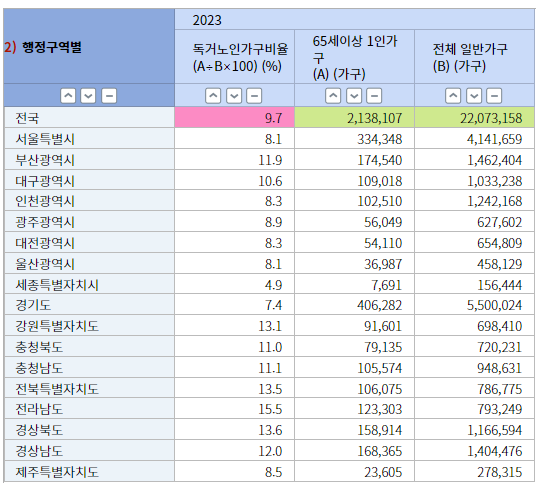 | 노령화지수 | 151.0 | 165.4 | 181.2 | 199.9 | 222.7 |