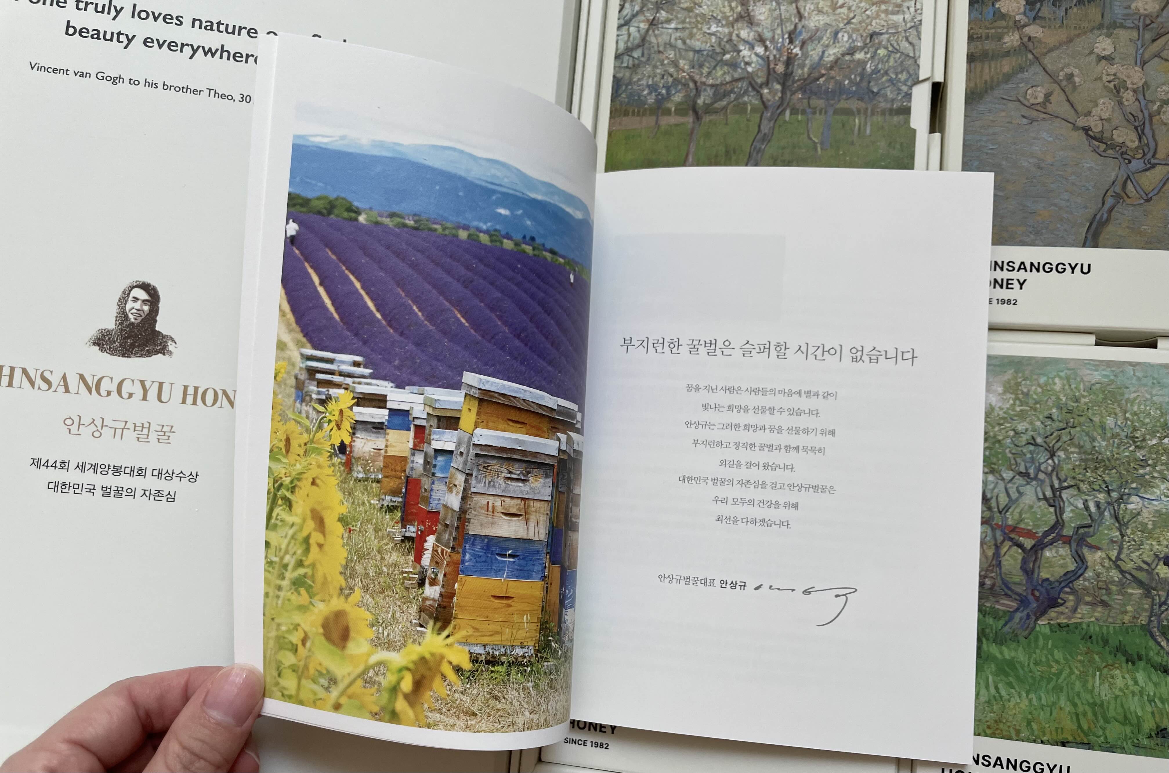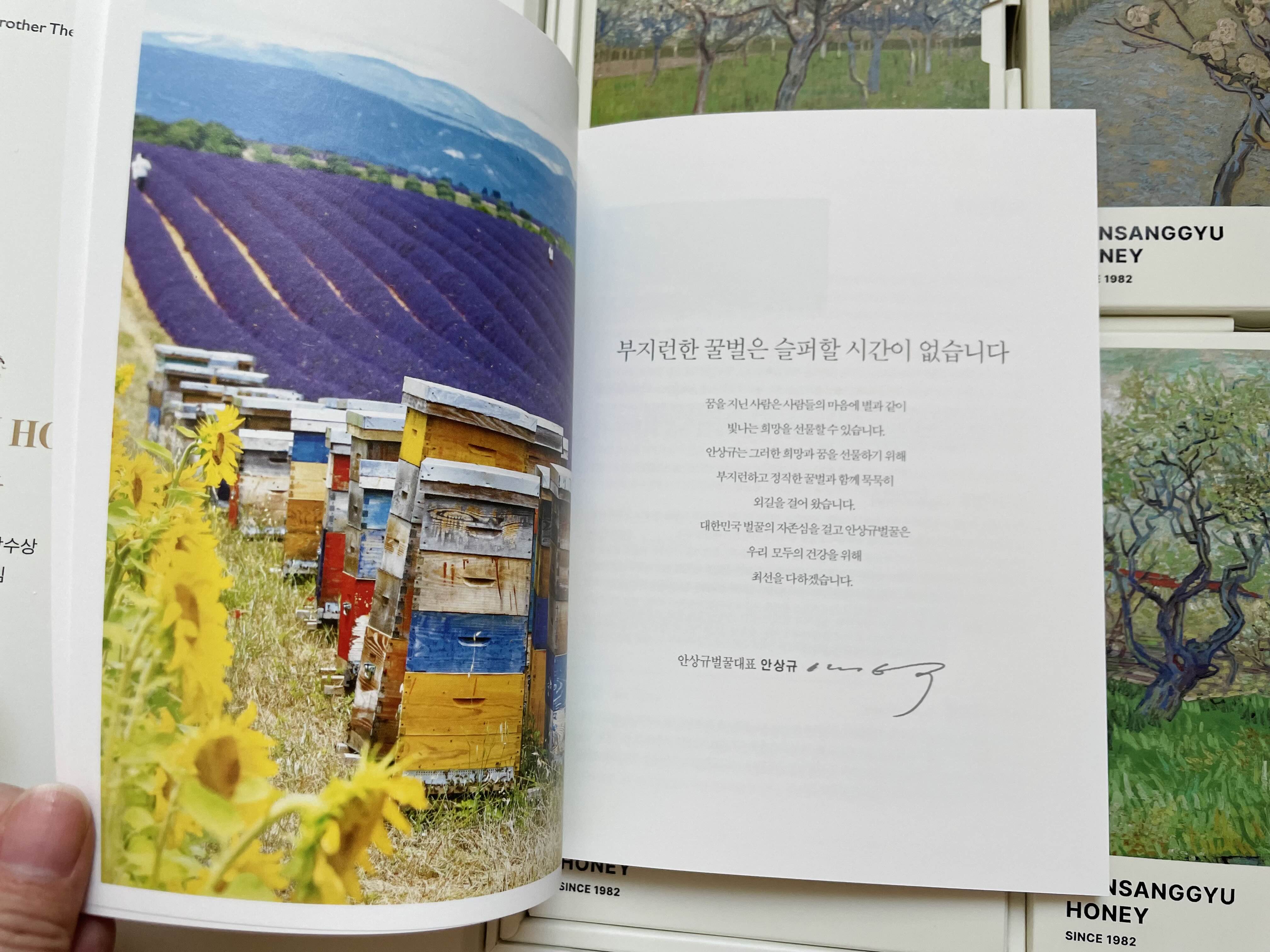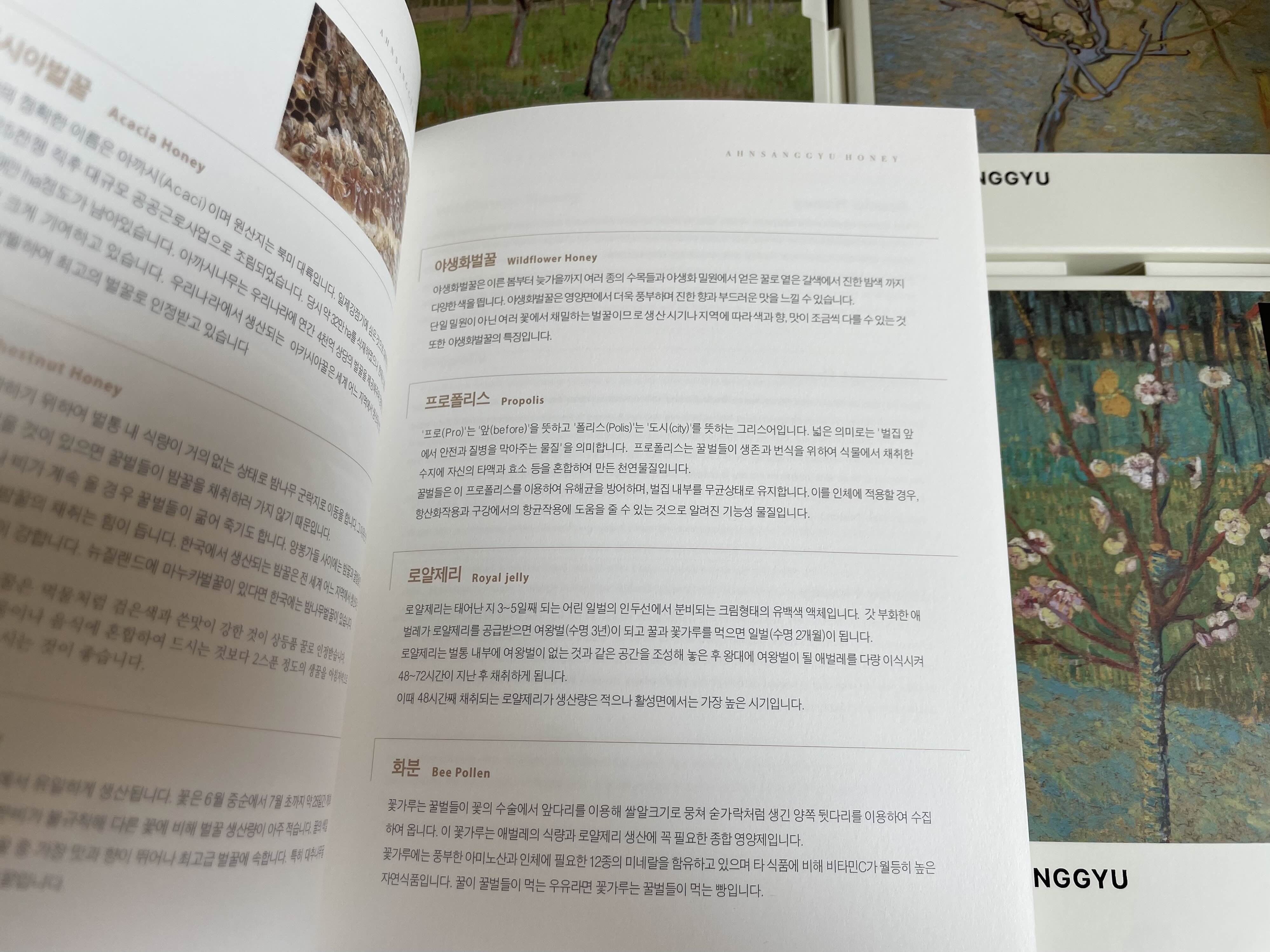 내부에도 디테일 그림이 네 폭이나 있어서 액자 같은 느낌이었고 왼쪽에는 상장 같은 디자인이었어요. 보증서도 고급지게 들어있었고 안상규 벌꿀에 대한 안내 책자도 예쁘게 들어 있었어요.