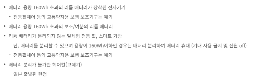 - 단, 배터리를 분리할 수 있으며 용량이 160Wh이하인 경우는 배터리 분리하여 배터리 휴대 (기내 사용 금지 및 전원 off)