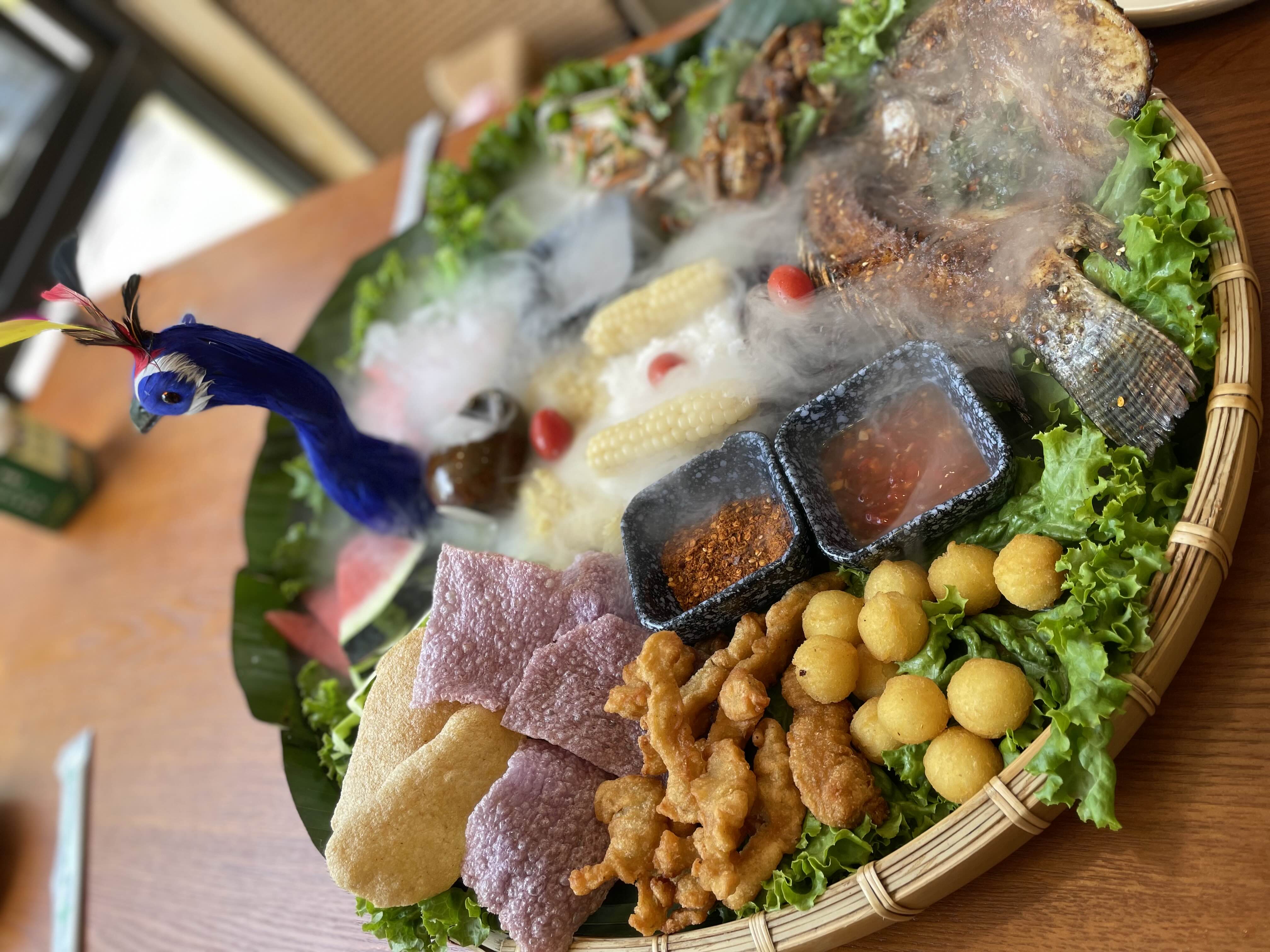 윈난성에는 소수민족이 많이 거주하고 있는데 그중에서 다이족 메뉴를 맛보았는데요. 외관 분위기는 태국 분위기 같았고 내부는 동남아 분위기 났어요. 역시 이번에도 여기 밥집 특색 메뉴를 주문했는데요. 물고기랑 삼겹살을 즈란으로 구운 것도 있었는데요. 저는 즈란으로 구운 삼격살이 가장 맛있었고 나머지는 그냥 그랬어요. 하지만 플레이팅이 신기하고 이쁘기도 해서 한번 즘 경험해도 좋을 것 같아요.