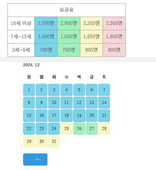요금표와 날짜가 나오는데 날짜를 선택하고 시간을 선택하면 됩니다.