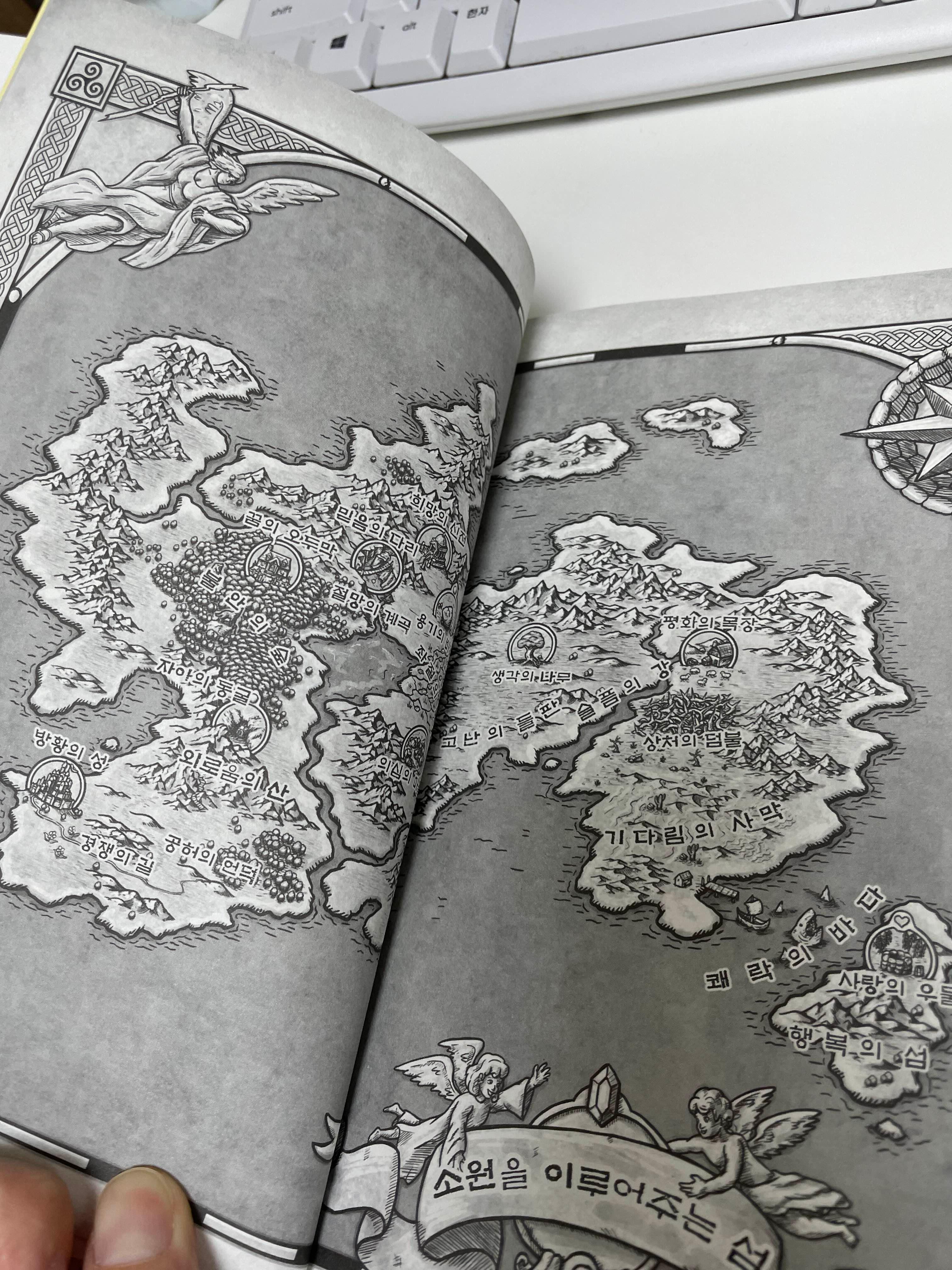 소설에 들어가기 앞서 처음에 이렇게 지도가 나오고 있는데요. 자아의 동굴, 외로움의 산, 슬픔의 강... 지도에 있는 스폿의 매 하나의 이름이 어찌도 이렇게 잘 지었는지 저는 속으로 정말로 감탄하지 않을 수 바께 없더군요. 그래서 한참이나 이 지도를 보고 혼자만의 생각에 빠졌답니다.