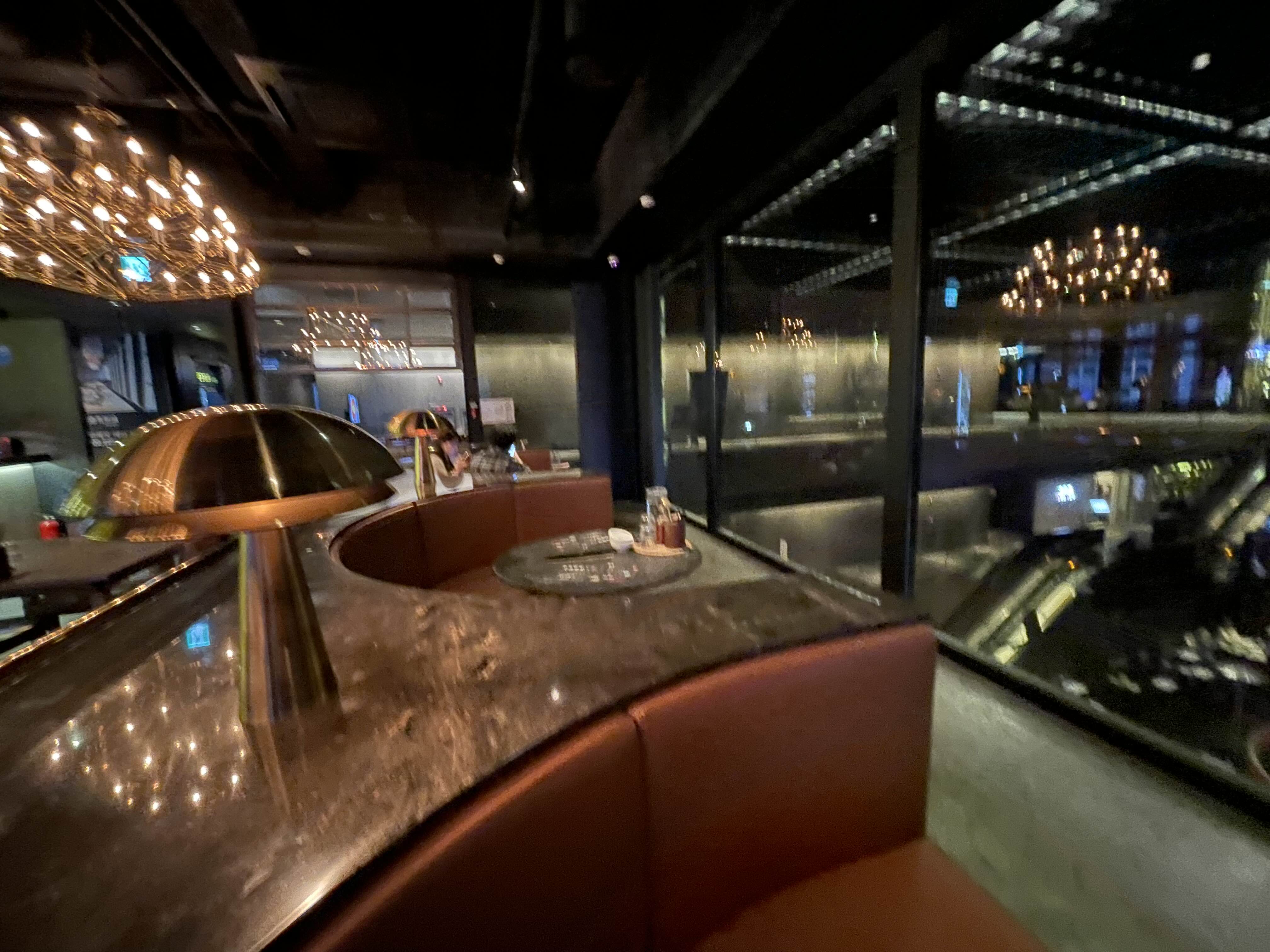 여기는 실내모습이 보이는 자리인데요. 살짝 부스 같은 느낌이기도 합니다. 조명과 밖에 다른 가게들의 테이블도 나름 분위기 있어 보이더라고요.