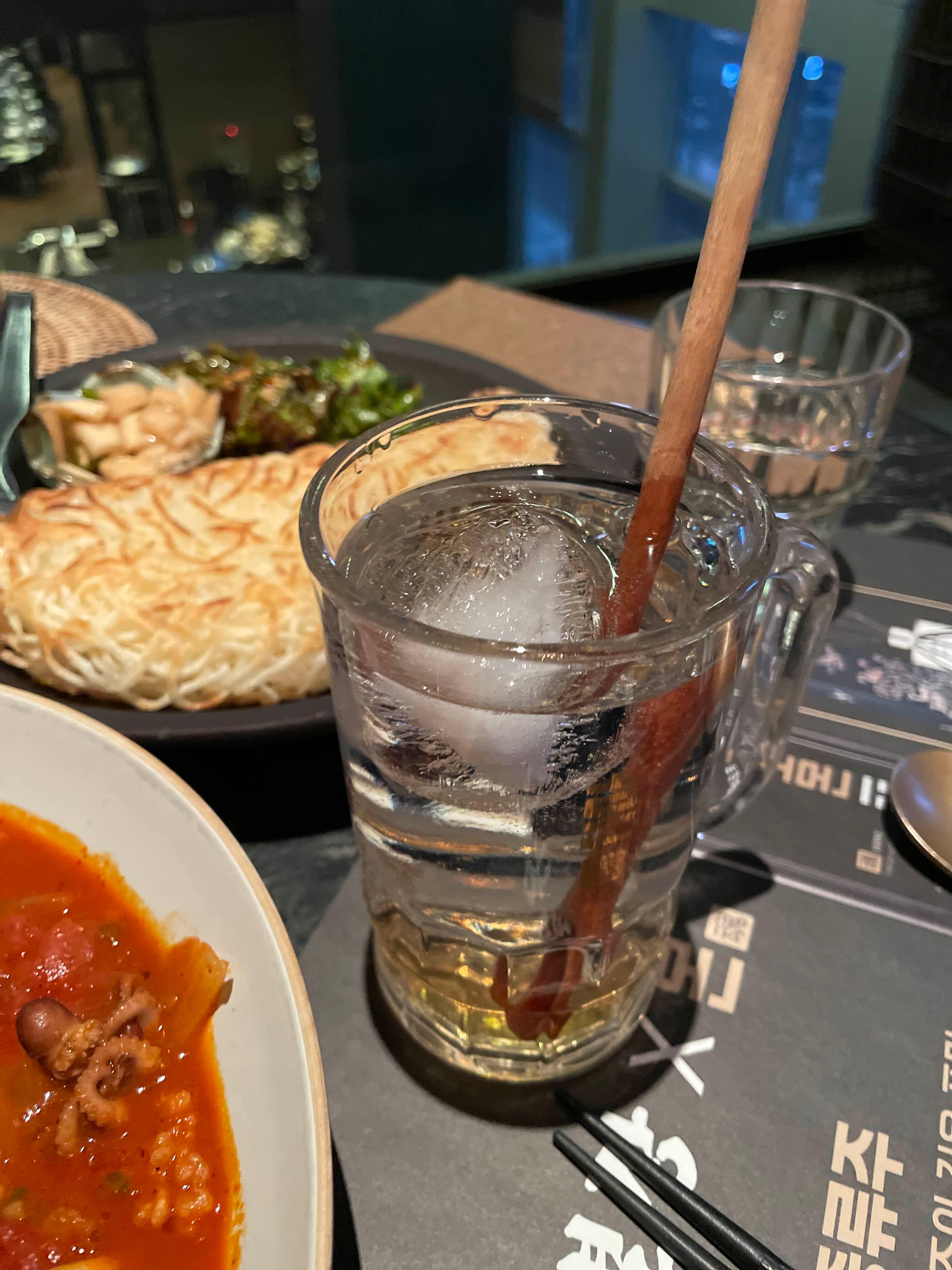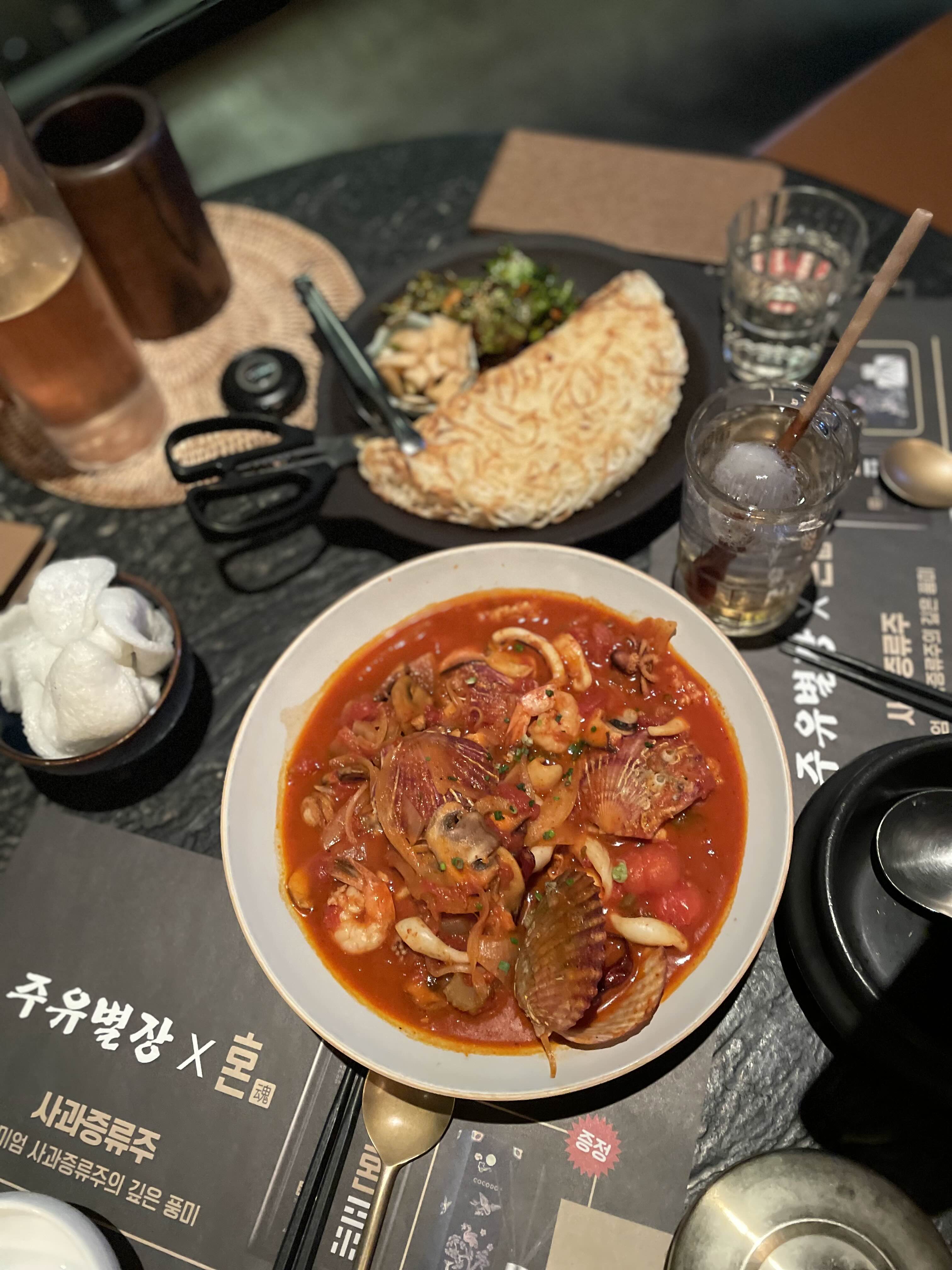 치즈 감자전이랑 토마토해물탕 그리고 하이볼 주문했는데요. 하이볼의 얼음부터 역시 맛있다는 느낌을 주더라고요. 이날 모두 세 곳의 하이볼을 먹었는데 친구는 여기 하이볼이 가장 맛있다고 하더라고요.