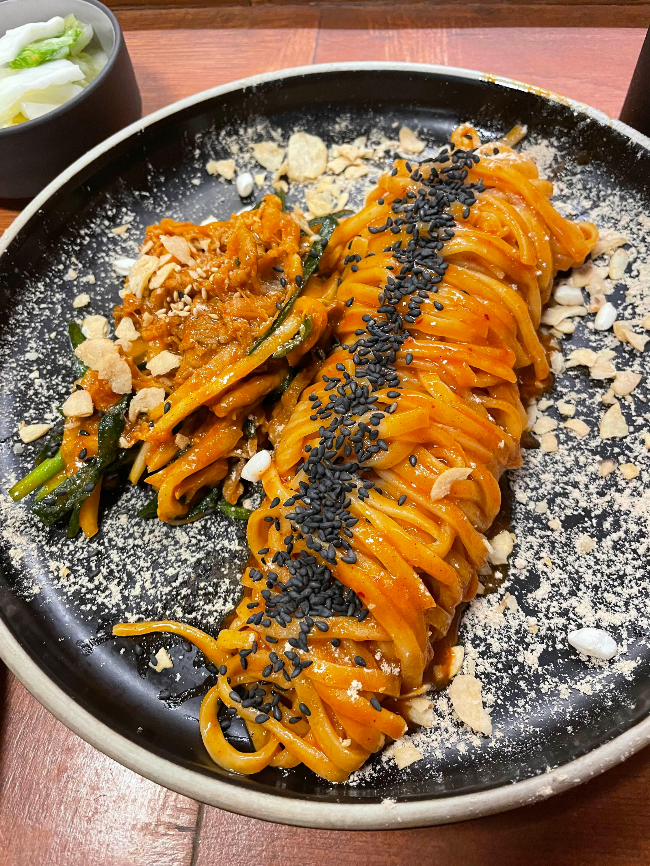 칼국수면도 새콤달콤한 맛과 옆에 곁들여진 아몬드 슬라이스가 고소함을 더해주고, 옆에 같이 얹어진 대배 고기는 더욱 식감을 즐겁게 하더라고요.