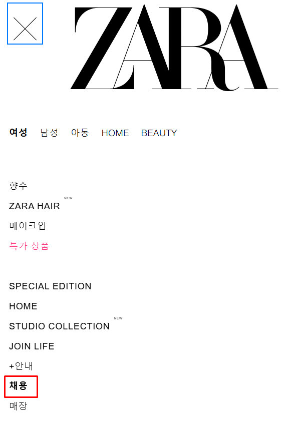 첫째는 자라 채용 공식 홈페이지 들어가서 TO가 있는지 보고 만약 있다면 공홈으로 지원할 수 있는데요. 자라 채용으로 검색하여 들어가서 왼쪽 매뉴얼을 클릭하면 채용이 나옵니다.