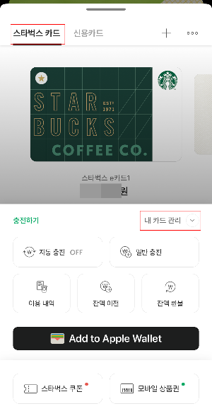 - 다음 스타벅스 카드에서 내 카드 관리를 누립니다.