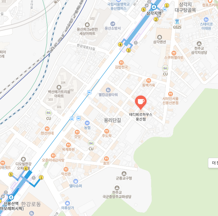 용리단길 가운데 위치해 있는데요. 쌤쌤쌤을 찾다 보면 테디뵈르하우스가 바로 보이는 것 같기도 하네요. 지하철로 가신다면 삼각지역이 더 가까운 것 같았어요.