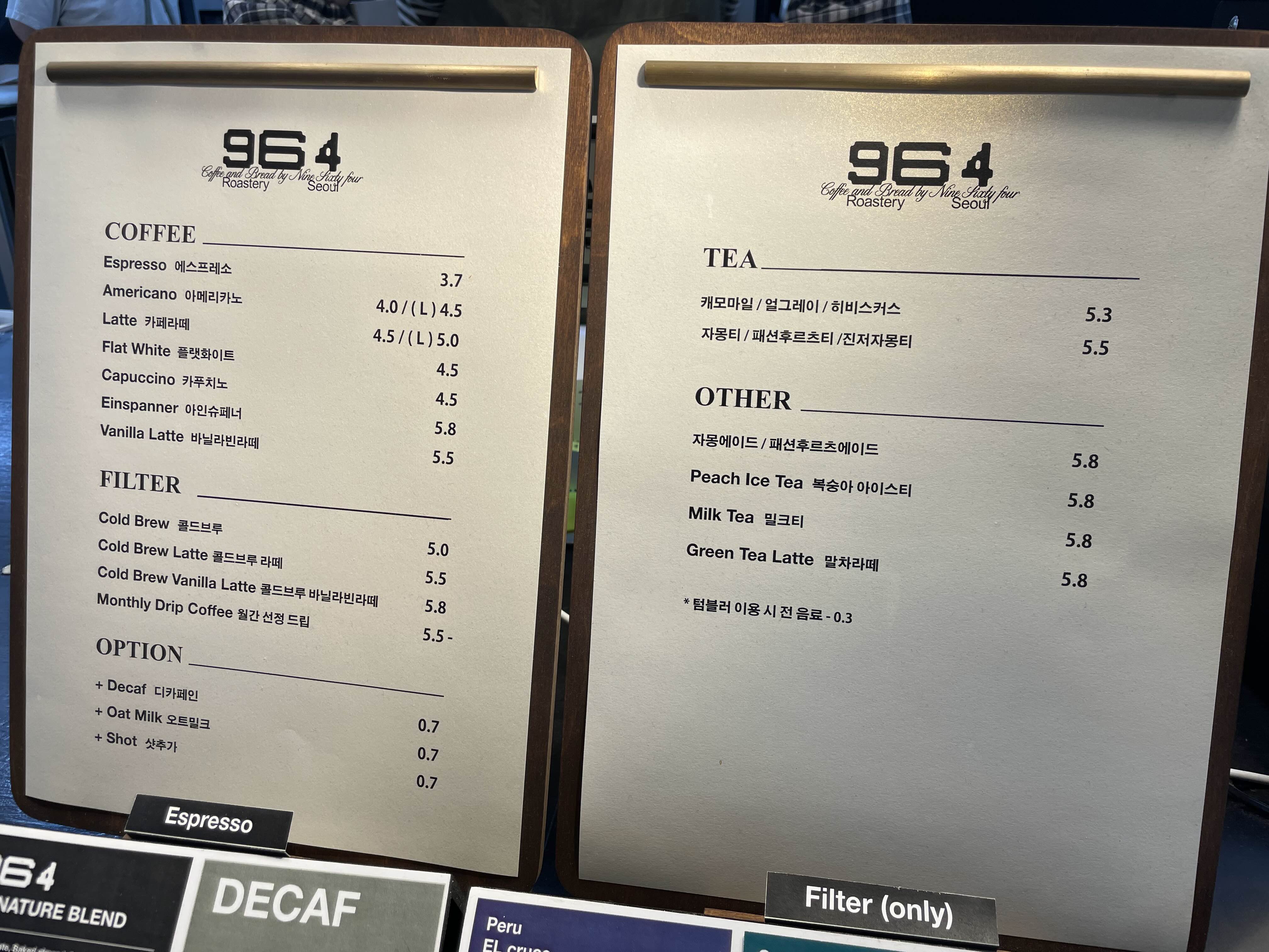 964 커피 로스터리 카페 음료는 다양하지는 않지만 그래도 기본은 다 있고요. 가격도 너무 비싸지 않고 에이드도 6천 원 기본으로 하는데 여기는 5천 원대로 조금 부담을 줄일 수도 있겠더라고요.