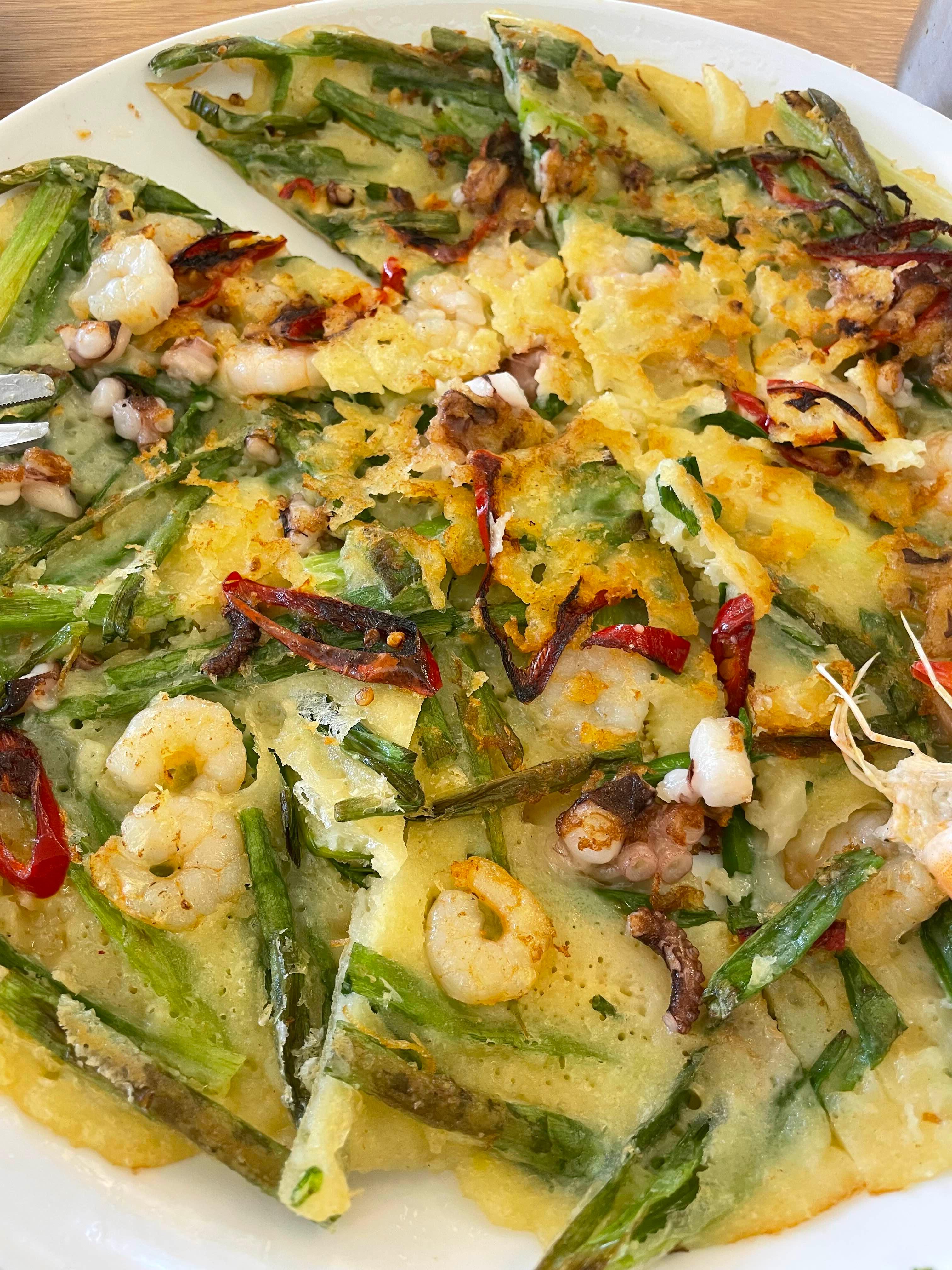 낙지 해물파전인데요. 낙지는 거의 다져있는 것 같긴 하지만 나름 먹을만했어요. 다만, 역시 매장에 들어설 때부터 느꼈던 이유인지 청결이 확실히 좀 안 되는 것 같았어요.