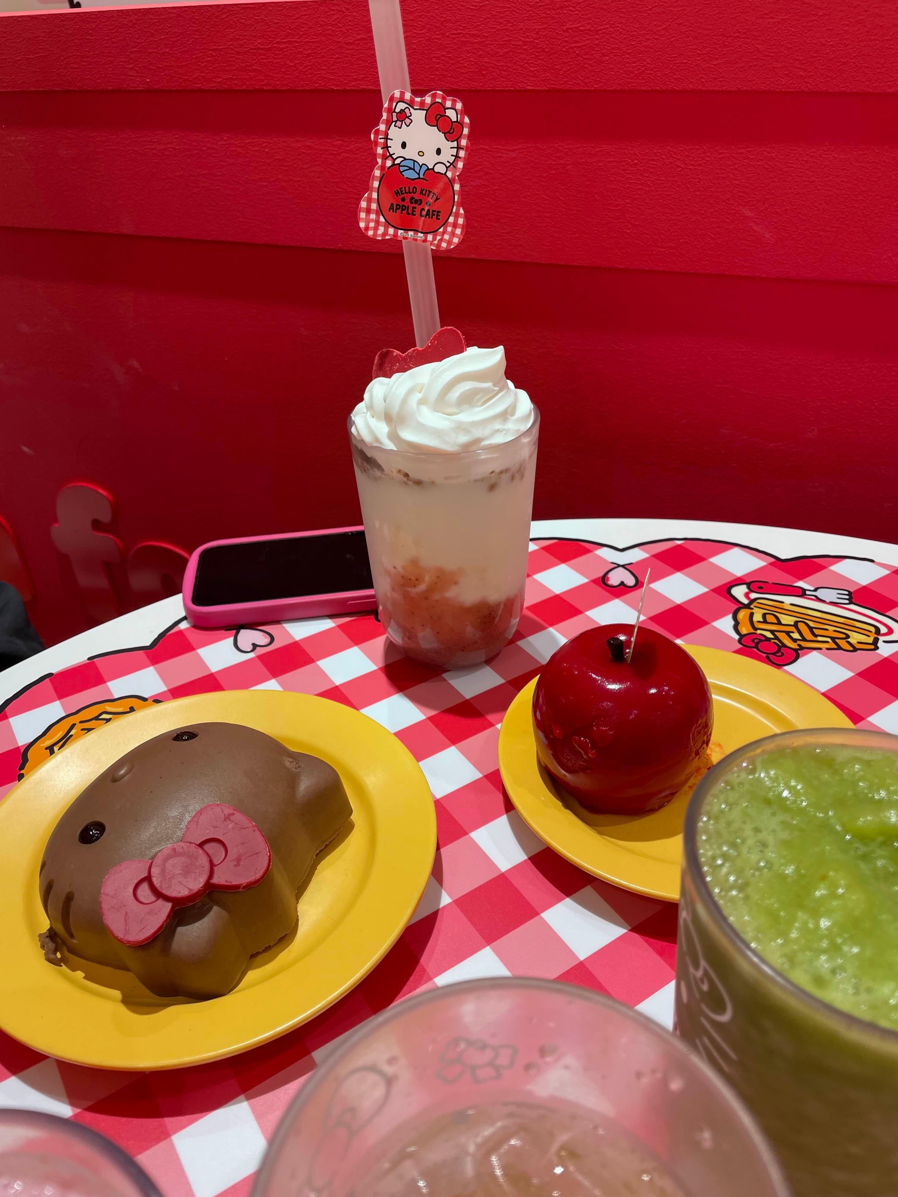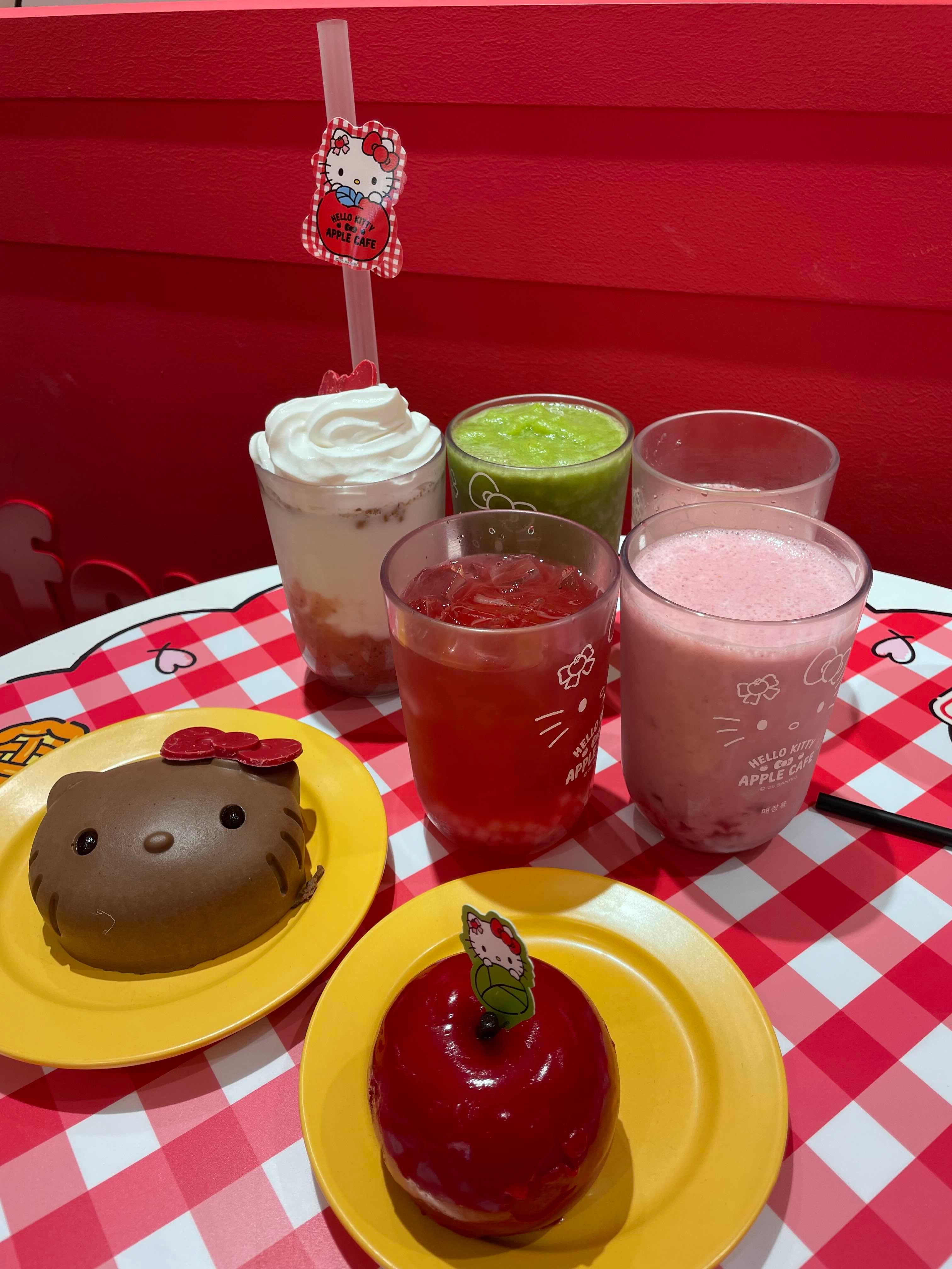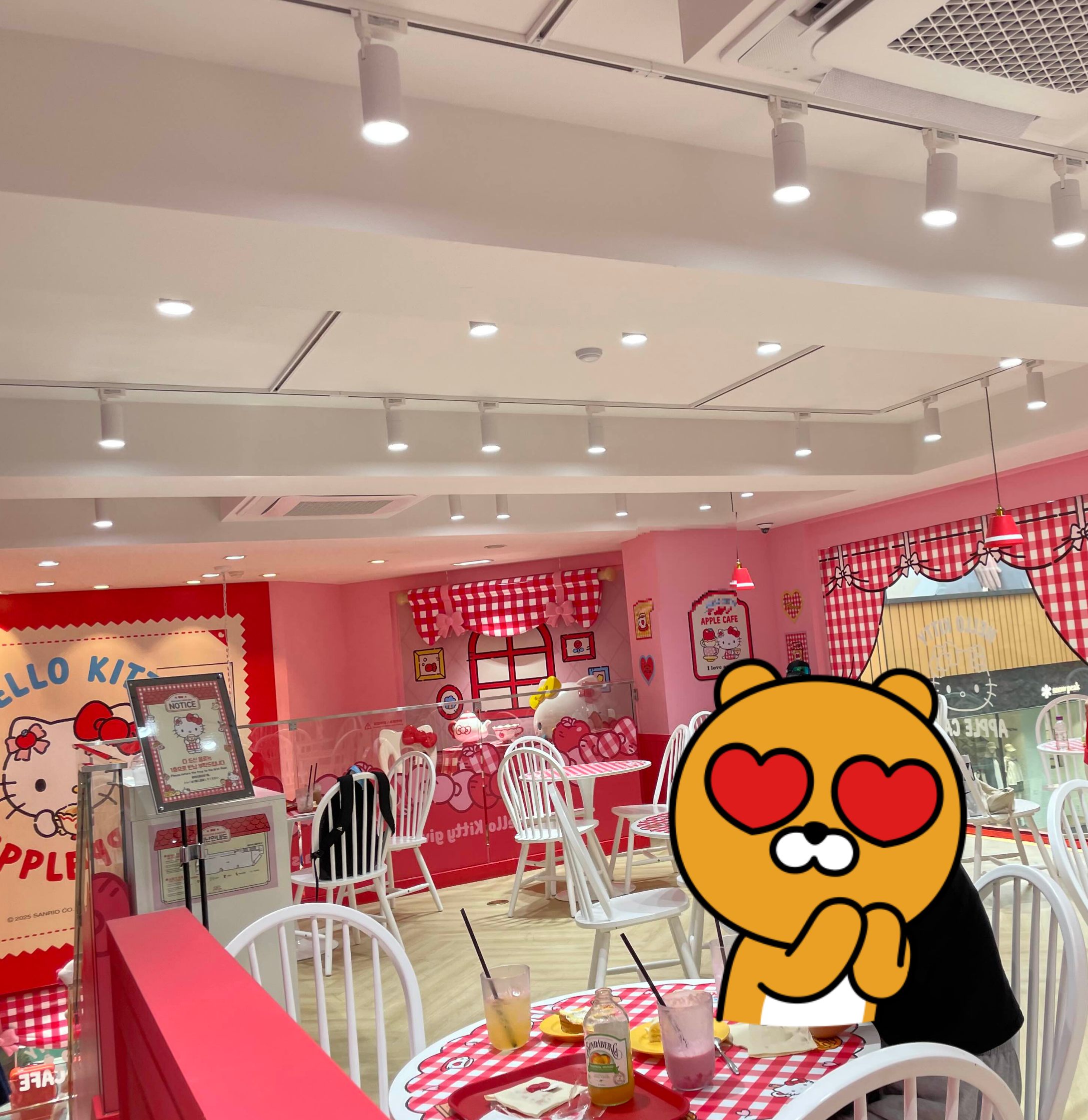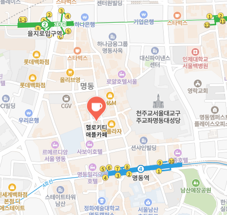 명동 헬로키티 애플카페는 명동 노점 먹자 거리 뒷골목에 위치해 있는데요. 1, 2, 3층이 모두 헬로키티 카페라서 건물 전체로 멀리서도 한 번에 볼 수 있더라고요. 영업시간은 오전 10시부터 시작인데요. 오픈 시간에 맞춰서 갔는데도 오픈전에 웨이팅 하시는 고객님들 계시더라고요. 다행히 웨이팅 없이 바로 입장했답니다. 1층에는 이미 만석이라 2층으로 갔어요.