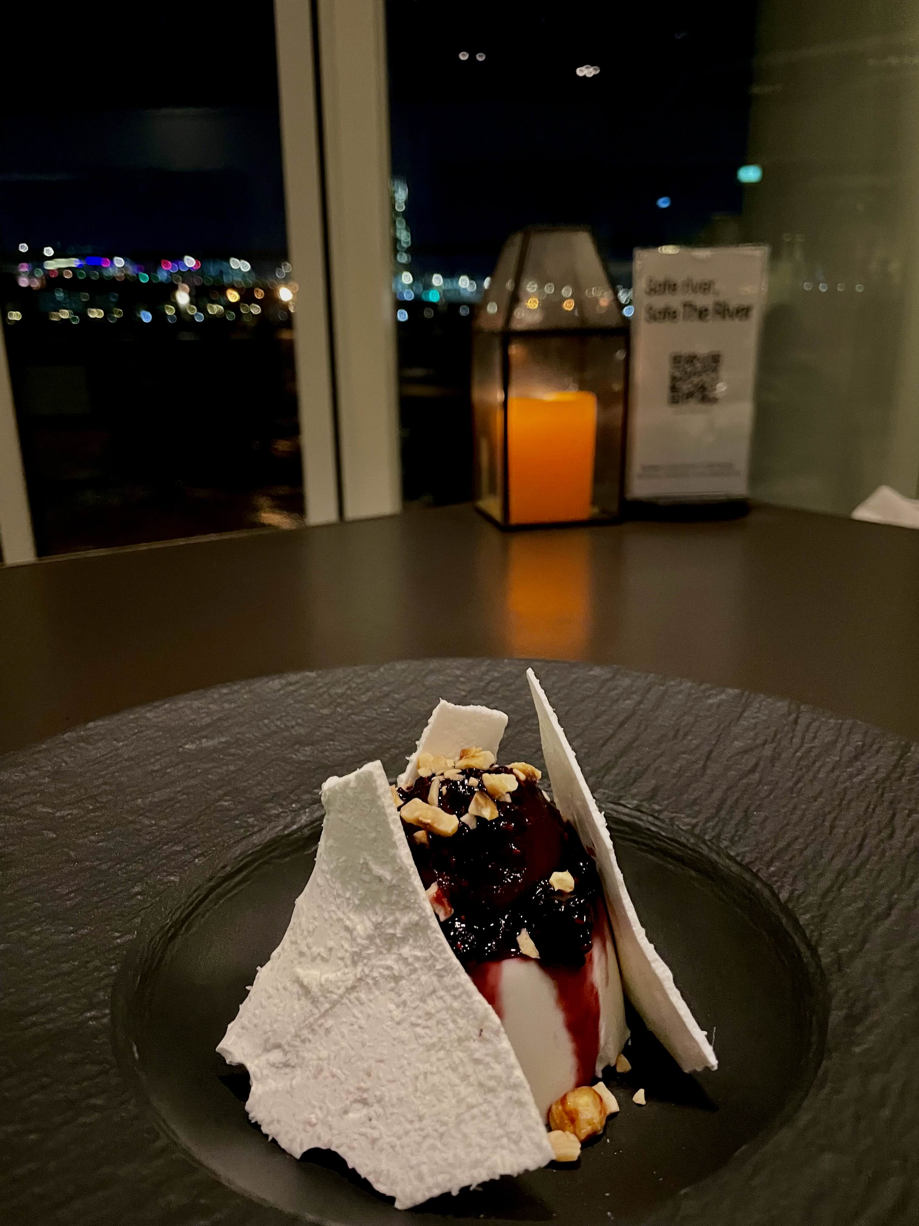마지막으로 디저트가 나왔는데요. 이제는 노을이 지고 밤이 되었네요.
