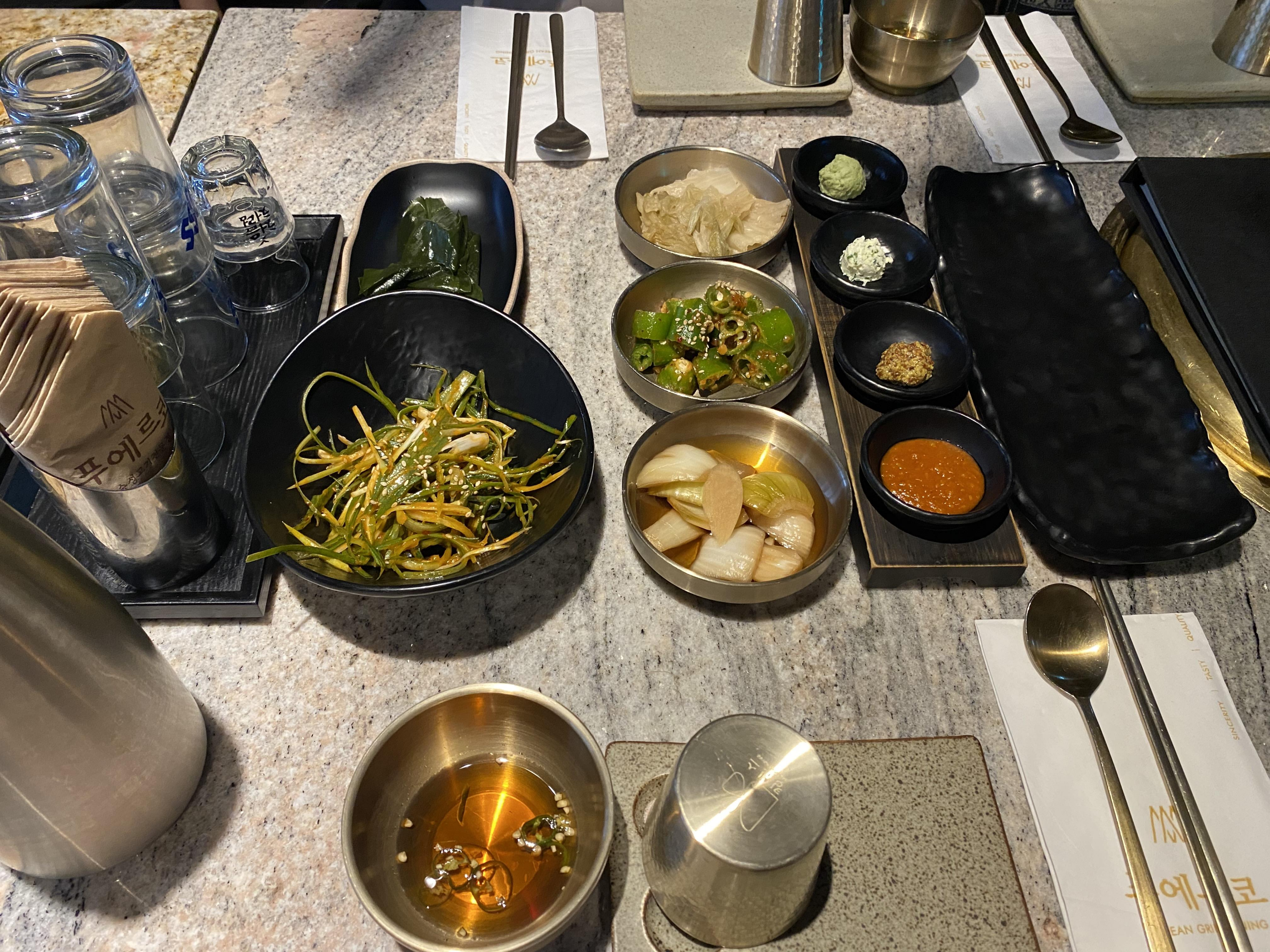 소스는 네 가지로 주셨는데 모두 맛있었어요. 회식의 장소답게 테이블마다 술잔이 모두 세팅되어 있었어요. 저희는 예약을 하고 방문했답니다.