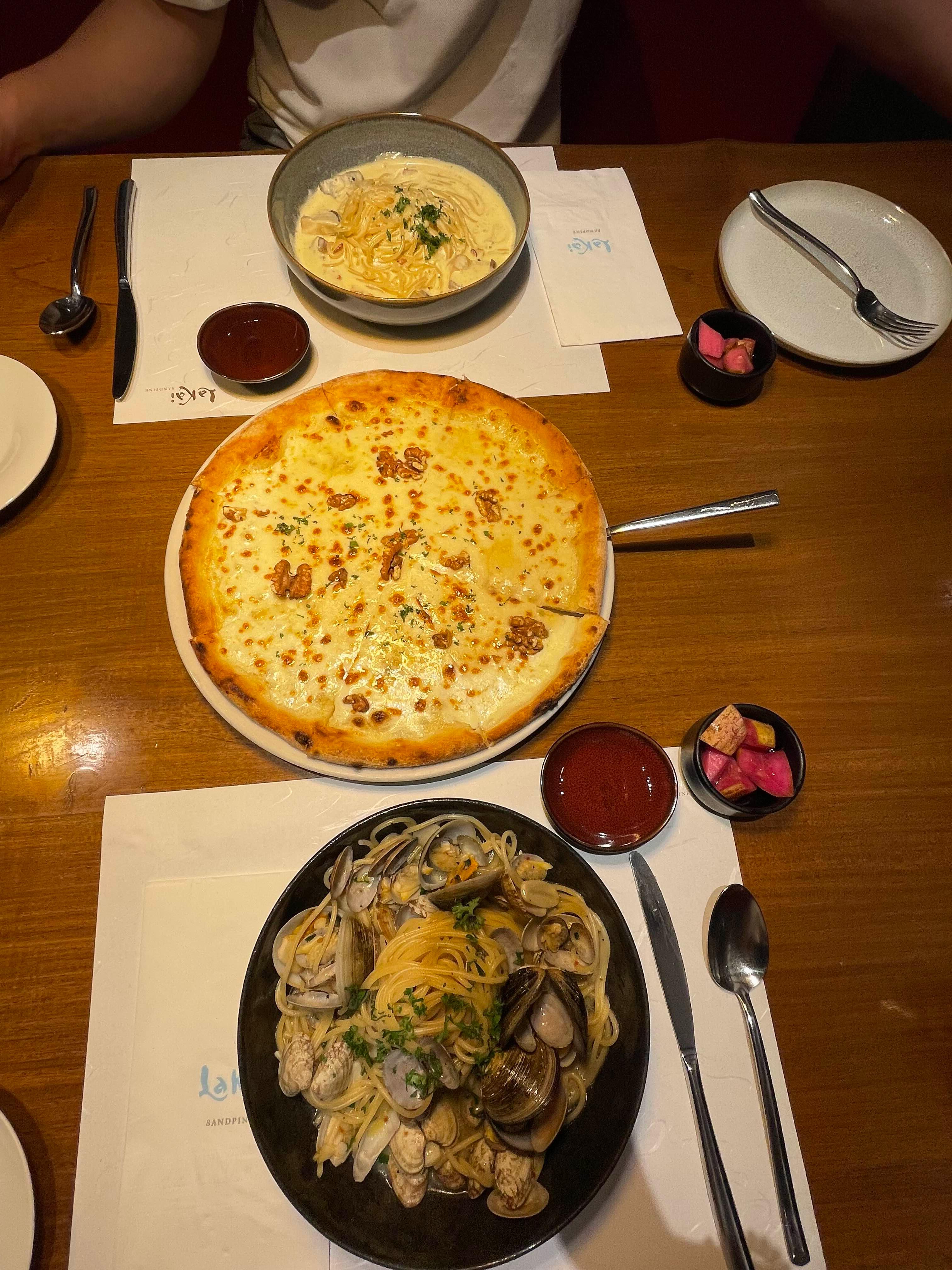 파스타는 까르보나라랑 봉골레를 주문했고 피자는 고르곤졸라를 주문했어요.