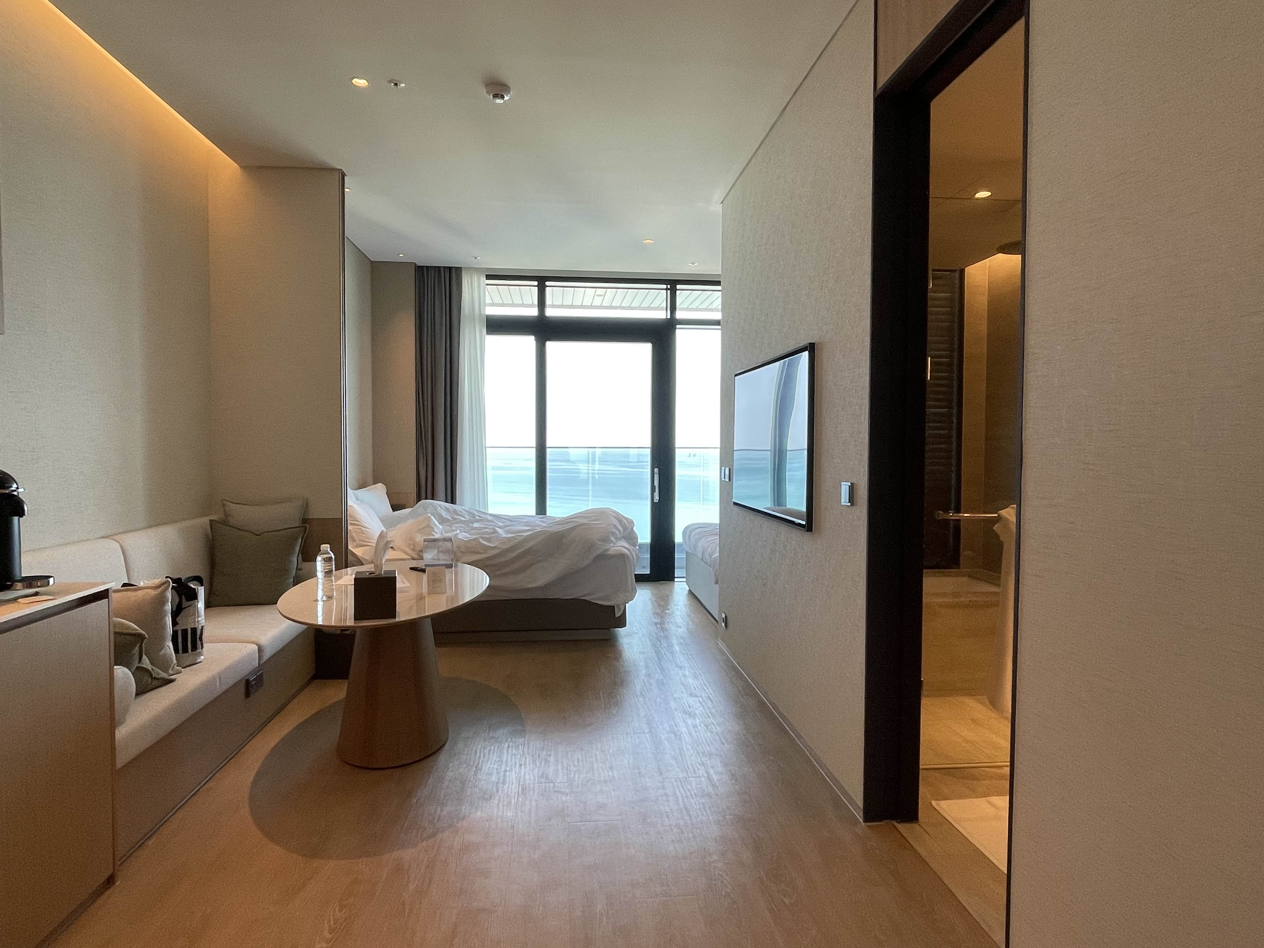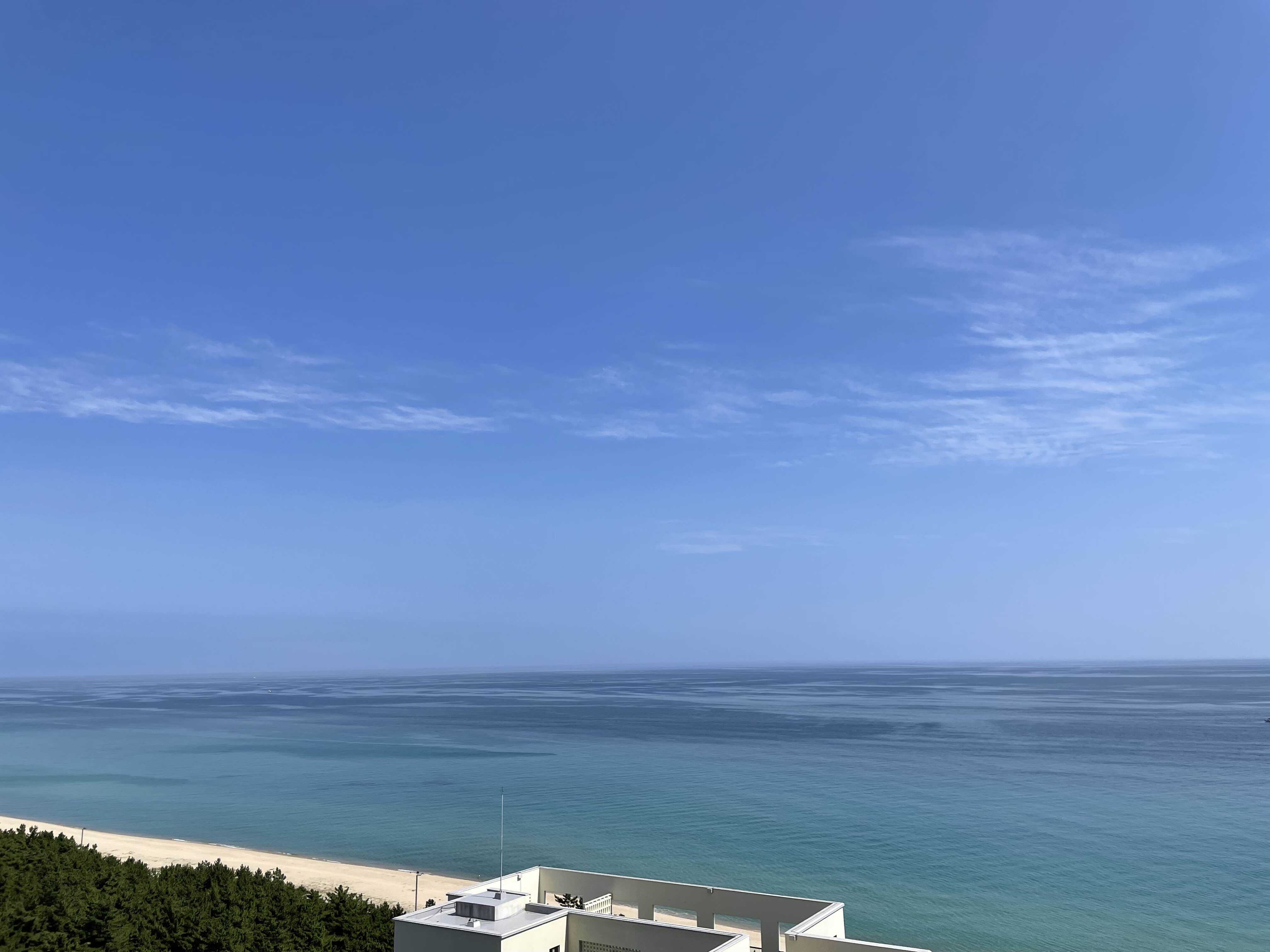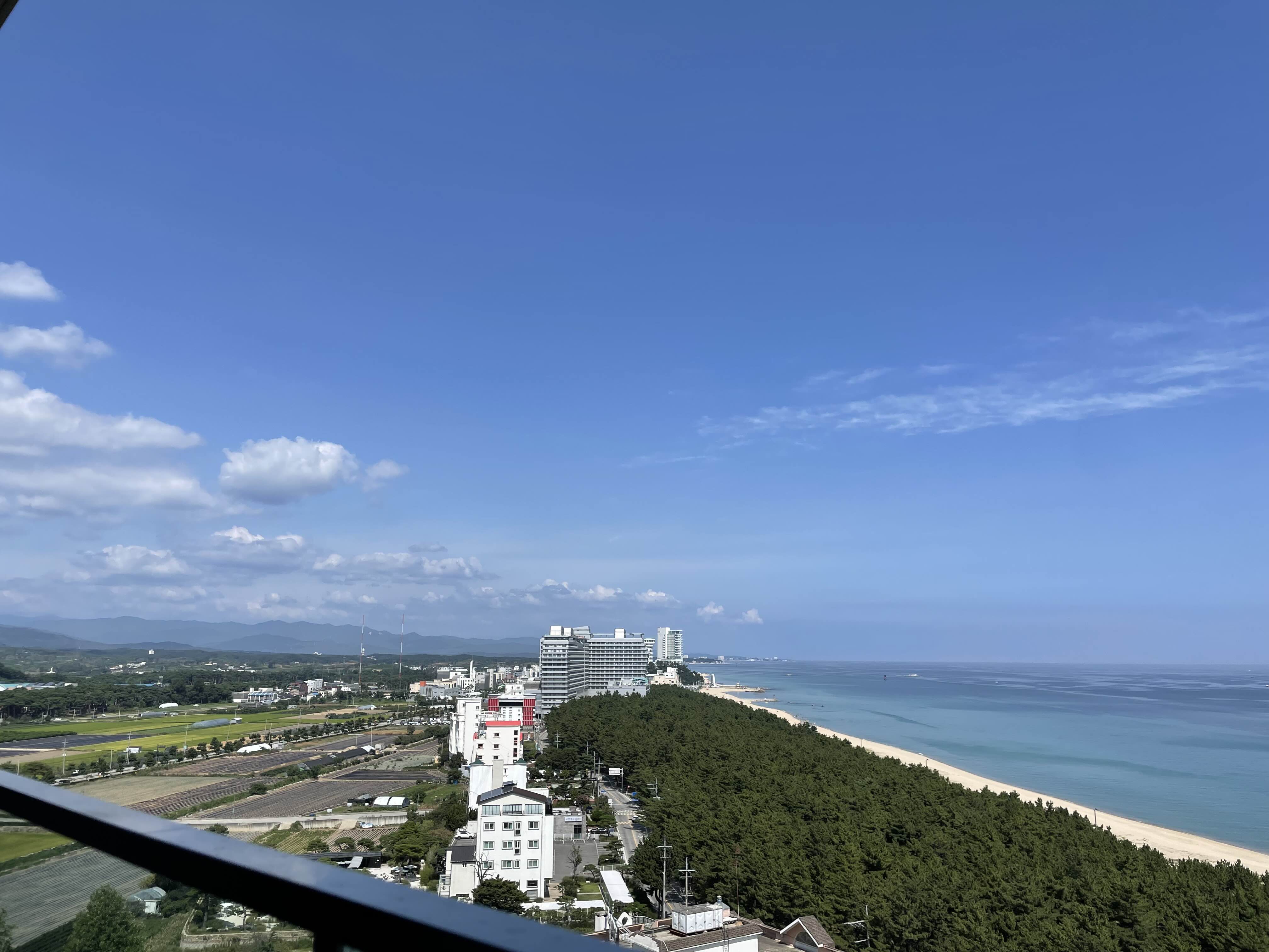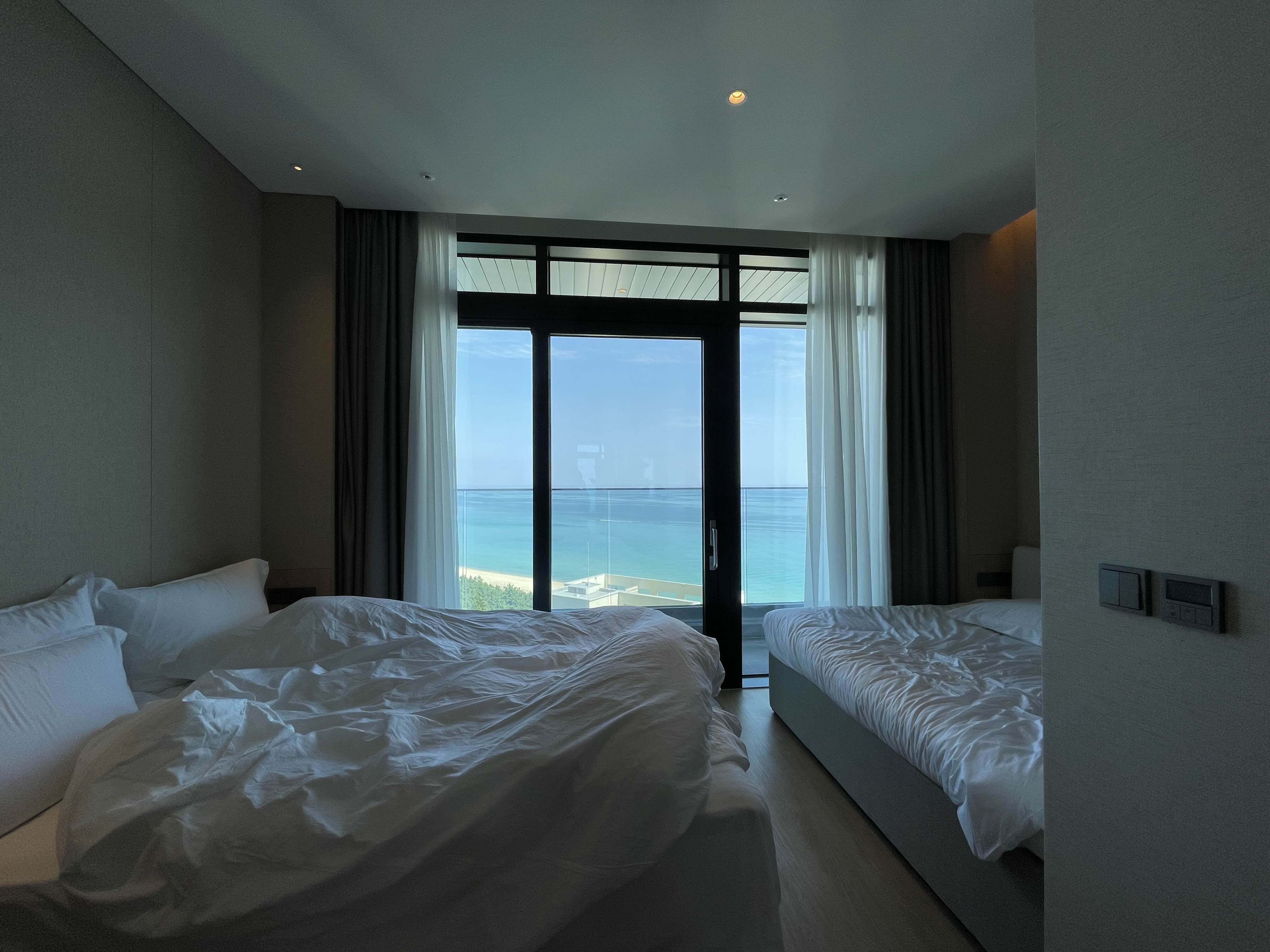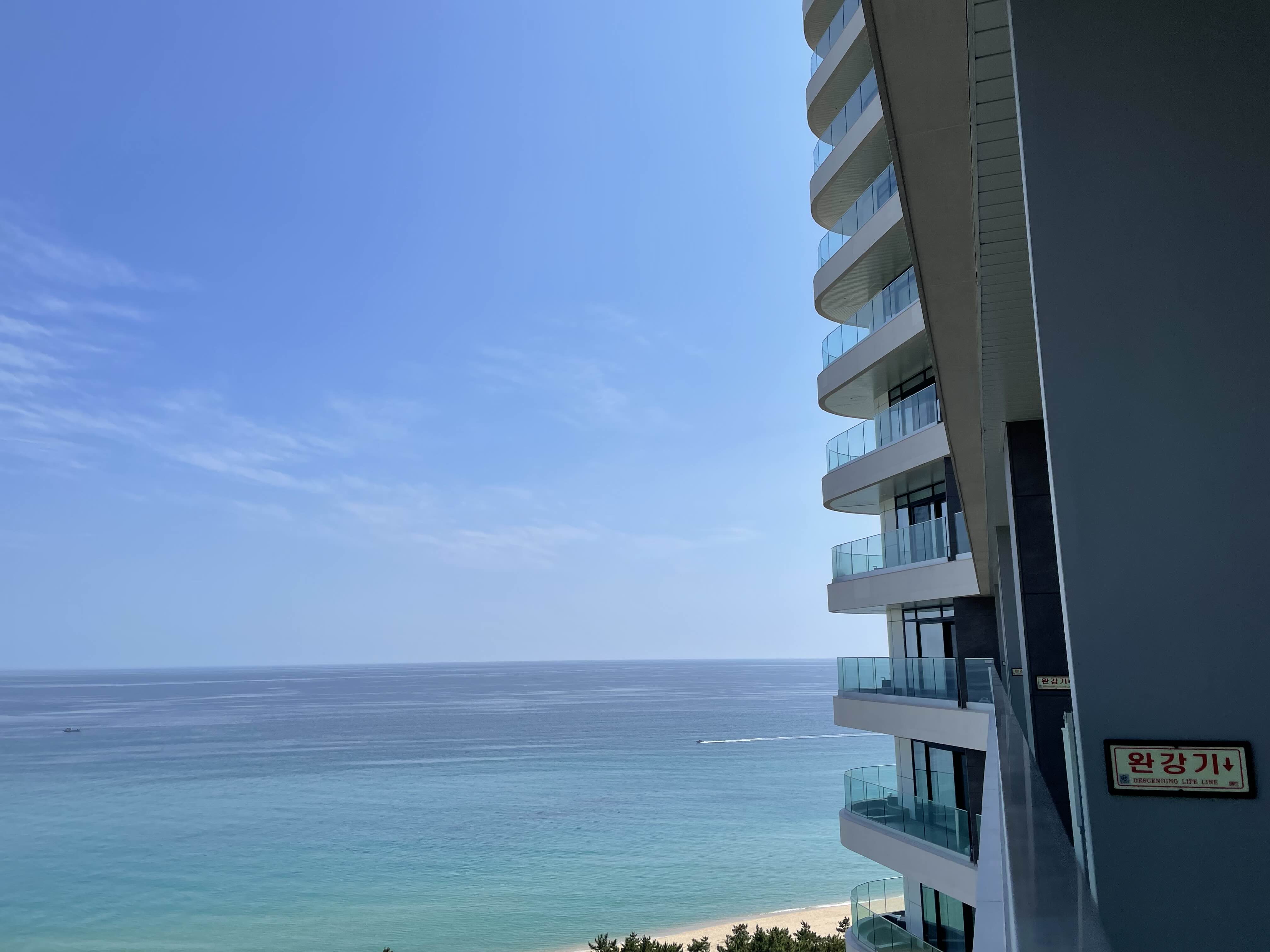 바다는 정말 고요한 바다가 한눈에 다 보이는 숨통이 트이는 뷰였어요. 아직 새거라 베란다 유리도 너무 깨끗해서 뷰를 보는데 방해가 없었어요.
