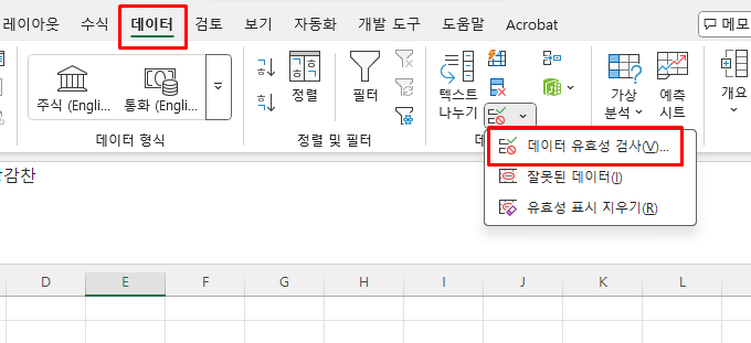 다음 해당 데이터를 블록 설정하고 엑셀 리본메뉴 (메뉴바)에서 데이터 유효성 검사 메뉴로 진행합니다.