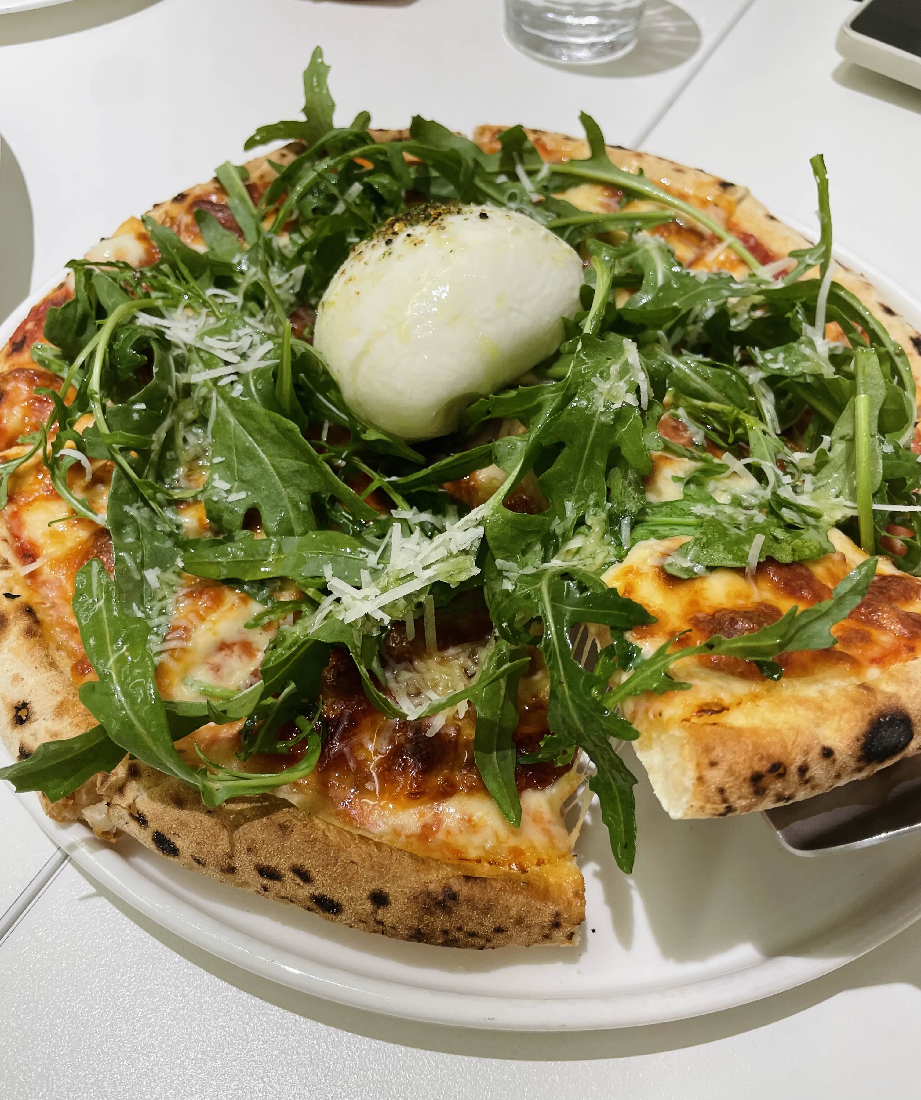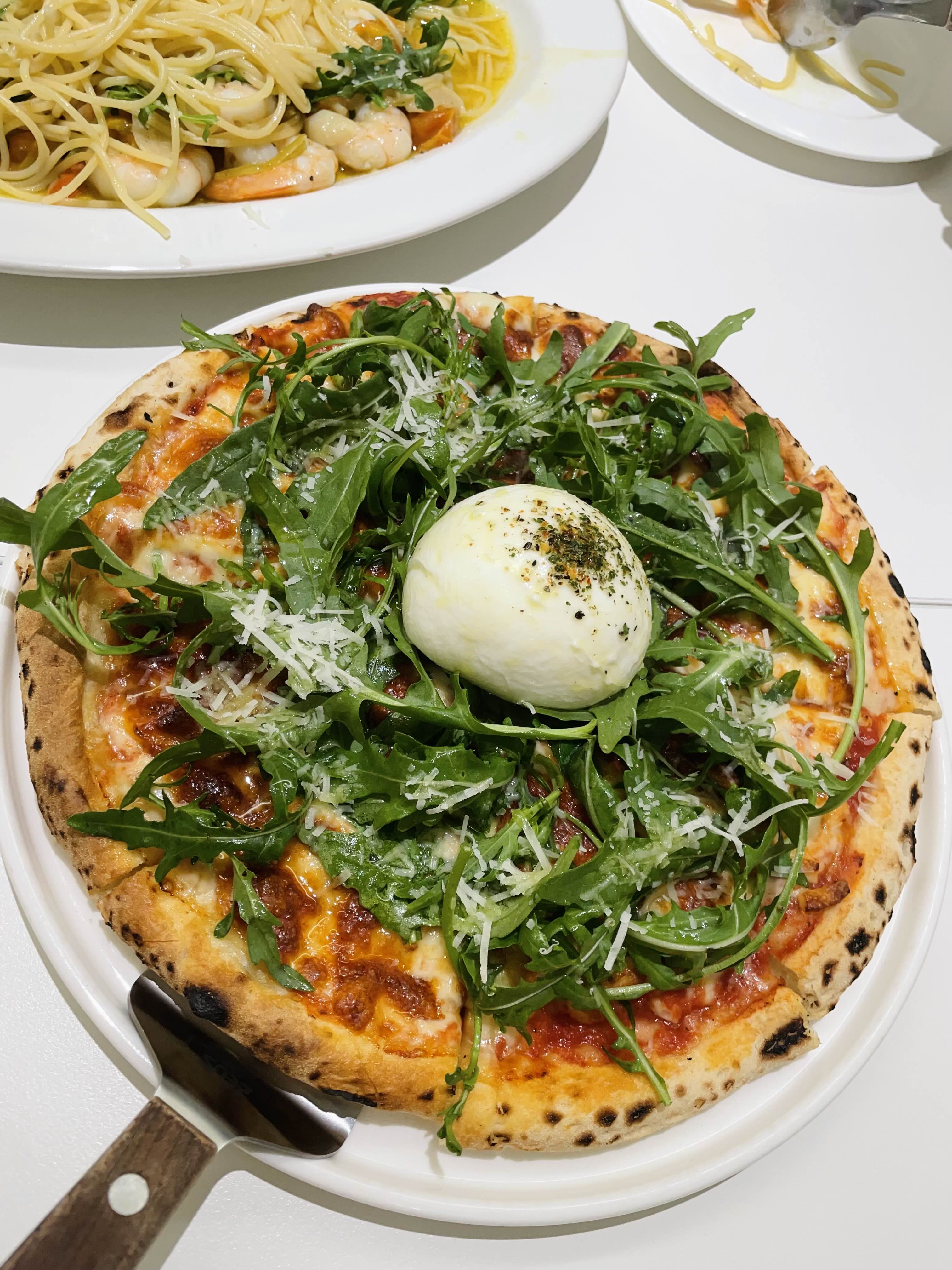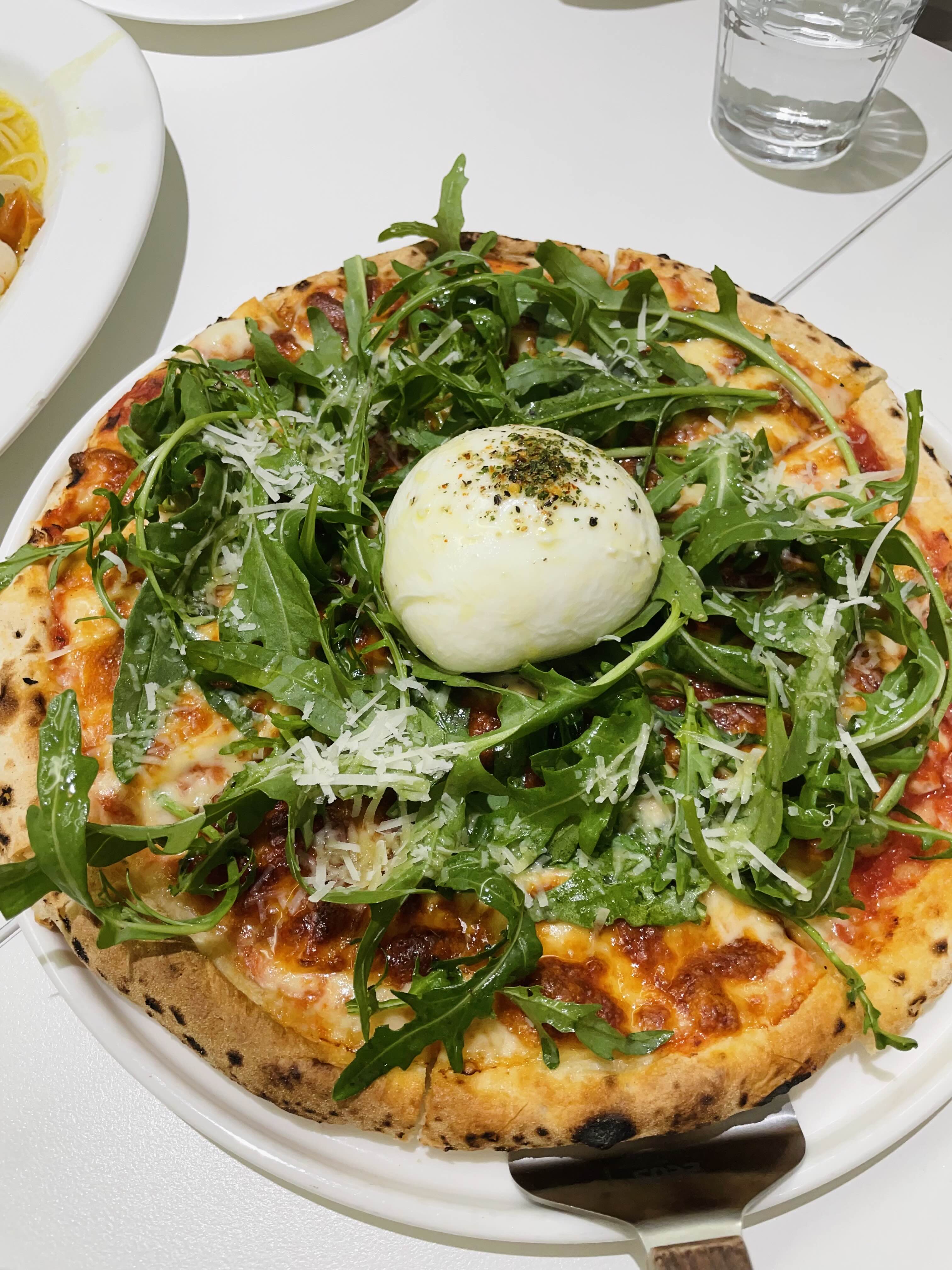 이건 부라타 마르게리타 피자인데요. 위에 올려진 부라타 치즈랑 쑥갓? 이랑 같이 먹으면 더 맛있는 것 같더라고요.
