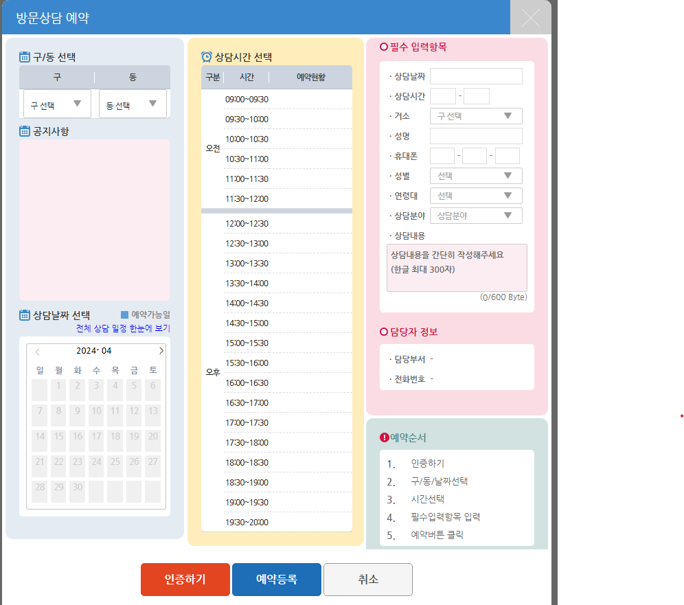 가까운 구와 동을 선택하여 날짜와 시간을 선택하시고 안내에 따라 진행하시면 됩니다. 이미지에서의 예약순서를 확인하시면 됩니다.