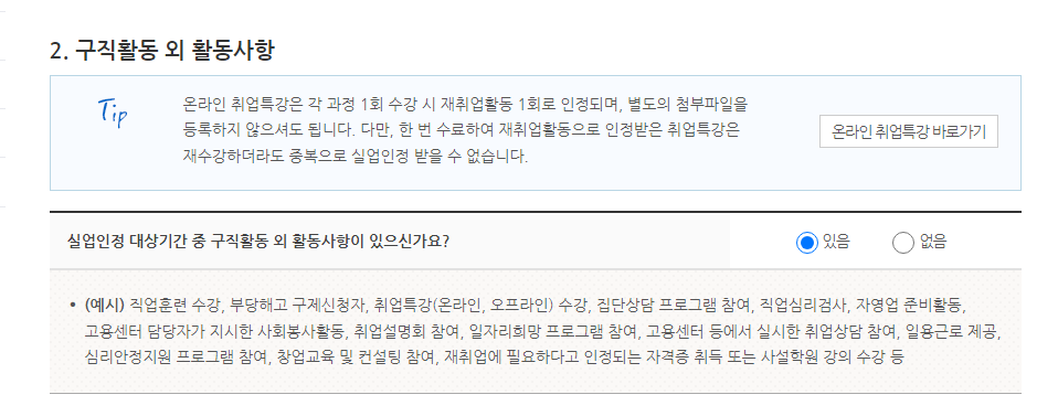 아래 이미지에서와 같이 '있음'으로 선택하셔야만 온라인 교육 항목을 선택하실 수 있습니다. 저는 처음에 없음으로 체크하여 한참을 방황하고 있었어요.