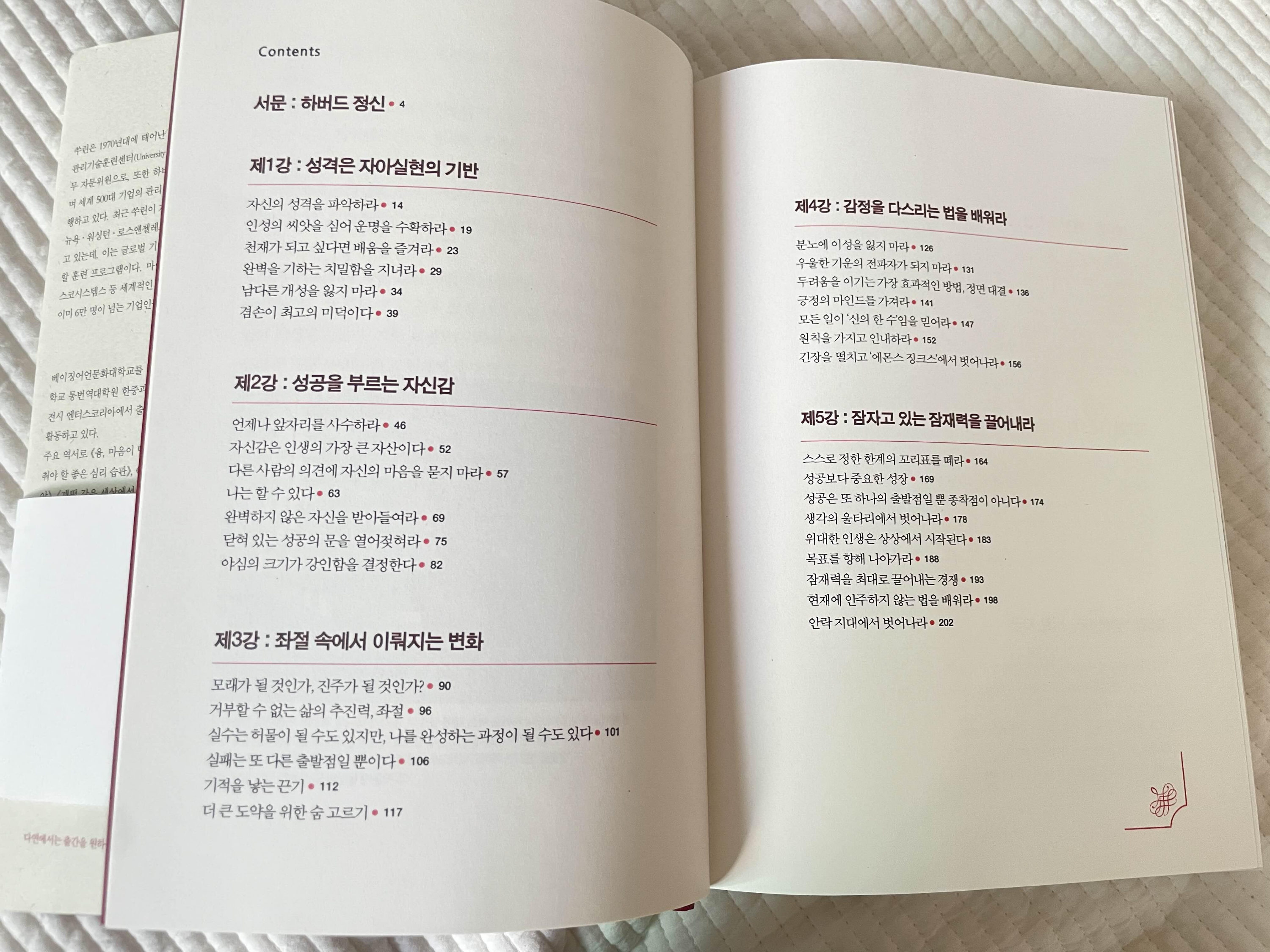 하버드대는 가지 못했지만 이 책을 통하여 간접적으로라도 너무나 많은 것을 다시 알아가게 되었는데요. 예를 들면 비록 현실생활에서도 내가 이미 알고 있지만 머릿속으로 지나쳤던 부분을 다시 꺼내 주어 그것이 맞으니 자신감을 갖고 열심히 해보자는 마음이 들더라고요.