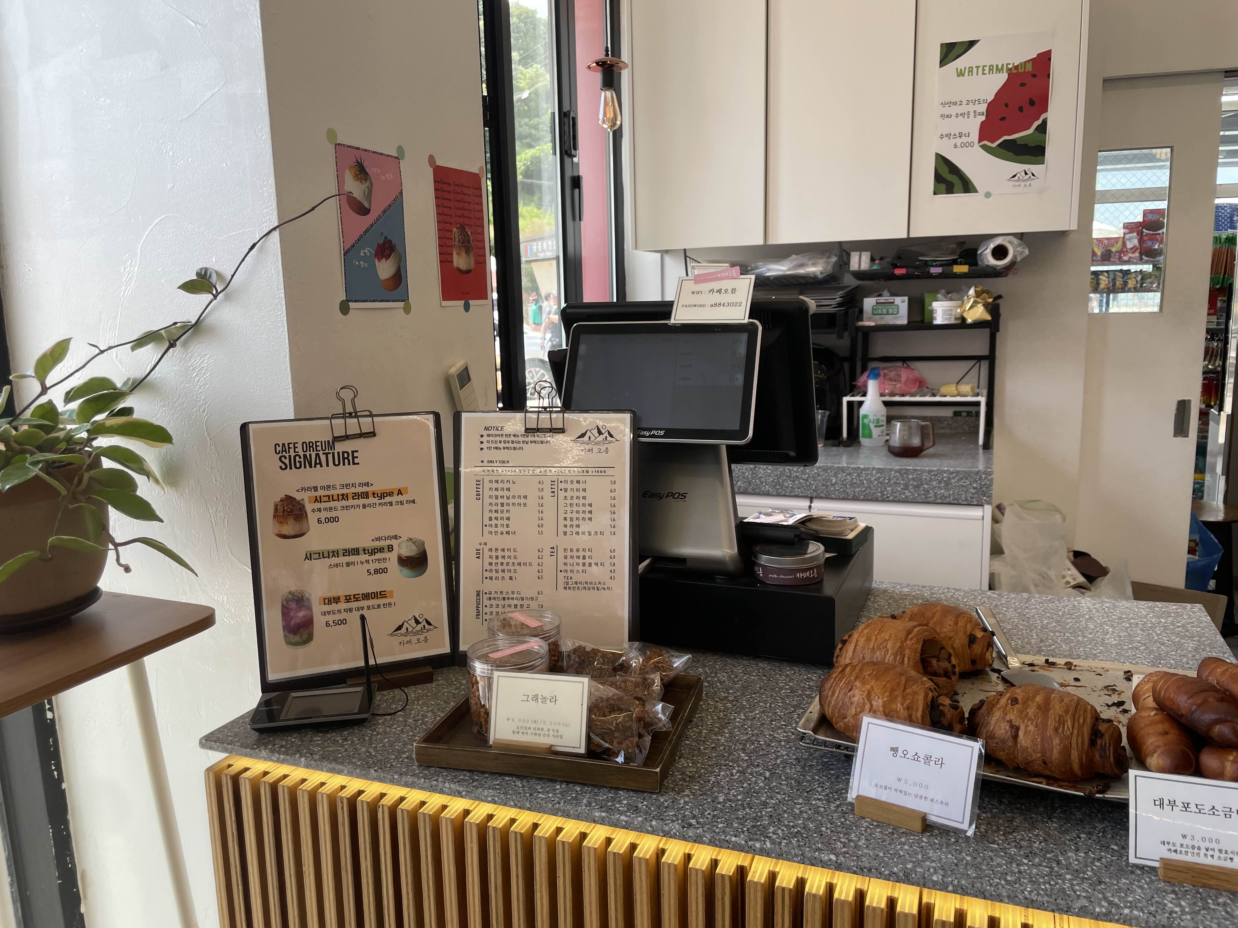 하지만 외관과 달리 내부는 조금 작은 감이 있는데요. 4인석 테이블 2개와 모임테이블 한 개랑 창문 바테이블 있더라고요.